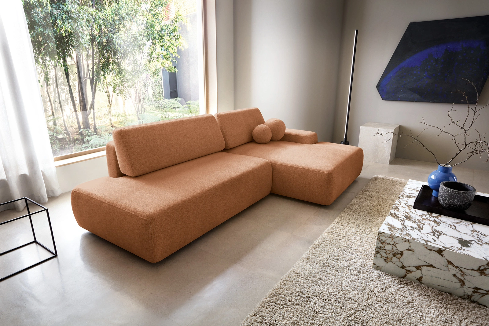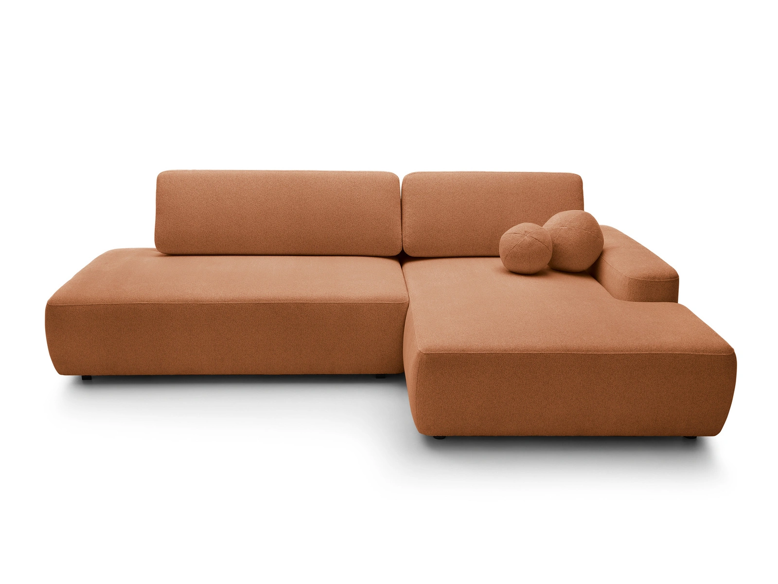 - Narożnik OLMI O (Raven 44, terakota) to energetyczny design w rozmiarze XXL. Szerokość 276 cm, szeroki szezlong i ozdobne poduszki kulki w zestawie. Posiada funkcję spania (210x125 cm) i pojemnik. Tkanina Raven 400g/m².