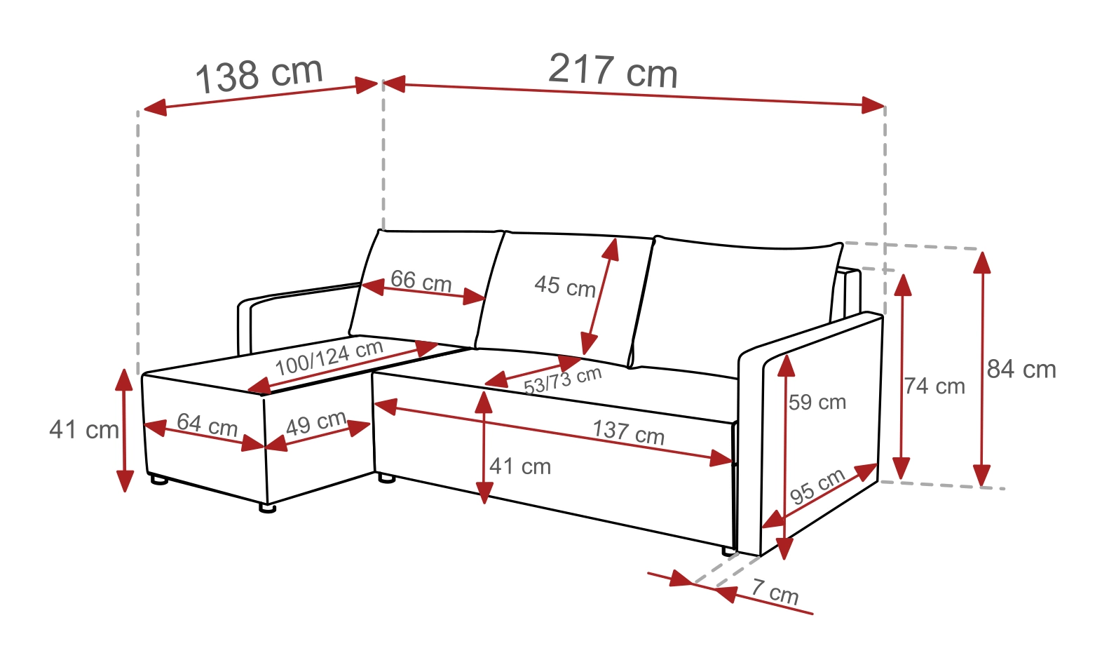 Mebel wyposażony został w funkcję spania, dzięki czemu w kilka chwil zamienia się w wygodne łóżko dla gości lub codziennego wypoczynku. Dodatkowy pojemnik na pościel pozwala zaoszczędzić miejsce i utrzymać porządek w salonie. Prosty kształt i miękkie poduchy oparciowe sprawiają, że narożnik świetnie odnajdzie się zarówno w małych mieszkaniach, jak i przestronnych wnętrzach. Możliwość wyboru strony narożnika ułatwia dopasowanie do układu pokoju.