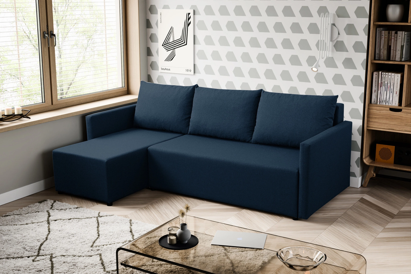 Narożnik Solid w tkaninie Faro z funkcją spania i pojemnikiem na pościel