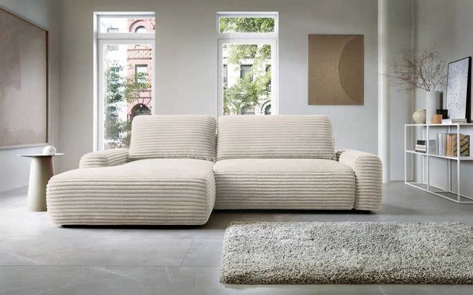 - Stylowy narożnik w kształcie litery L VIGO w modnej tkaninie sztruksowej Ambience 02 (klasyczny beż). Mebel oferuje funkcję spania oraz praktyczny pojemnik na pościel. Szerokie pasy sztruksu i ciepły odcień beżu wprowadzają do wnętrza przytulną atmosferę