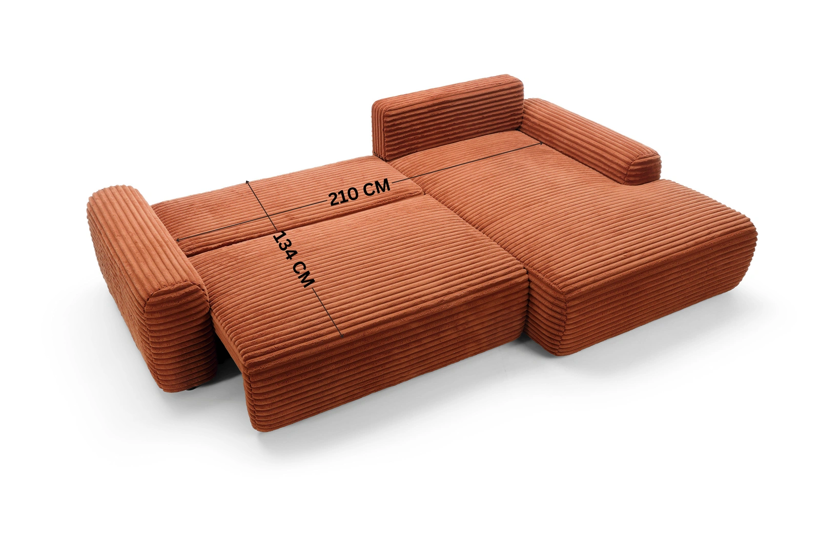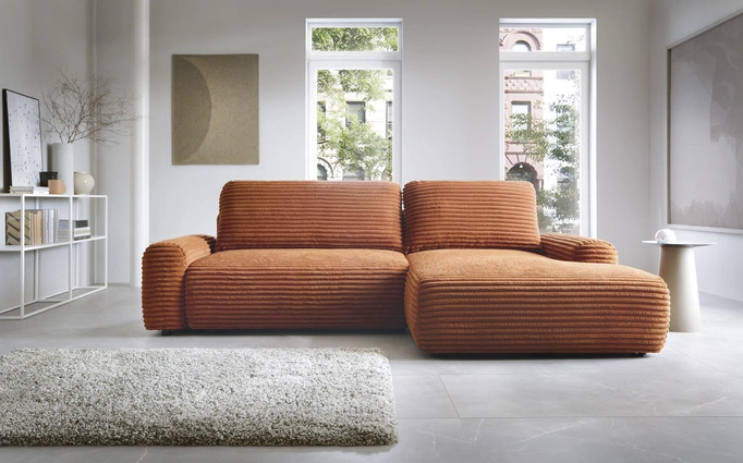 - Wyrazisty narożnik w kształcie litery L VIGO w modnej tkaninie sztruksowej Ambience 09 (intensywny rudy / ceglasty). Mebel posiada dużą funkcję spania oraz pojemnik na pościel. Energetyczny kolor i miękki, szeroki sztruks ożywią każdy salon.