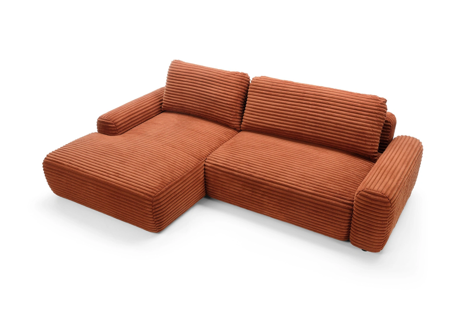 - Wyrazisty narożnik w kształcie litery L VIGO w modnej tkaninie sztruksowej Ambience 09 (intensywny rudy / ceglasty). Mebel posiada dużą funkcję spania oraz pojemnik na pościel. Energetyczny kolor i miękki, szeroki sztruks ożywią każdy salon.
