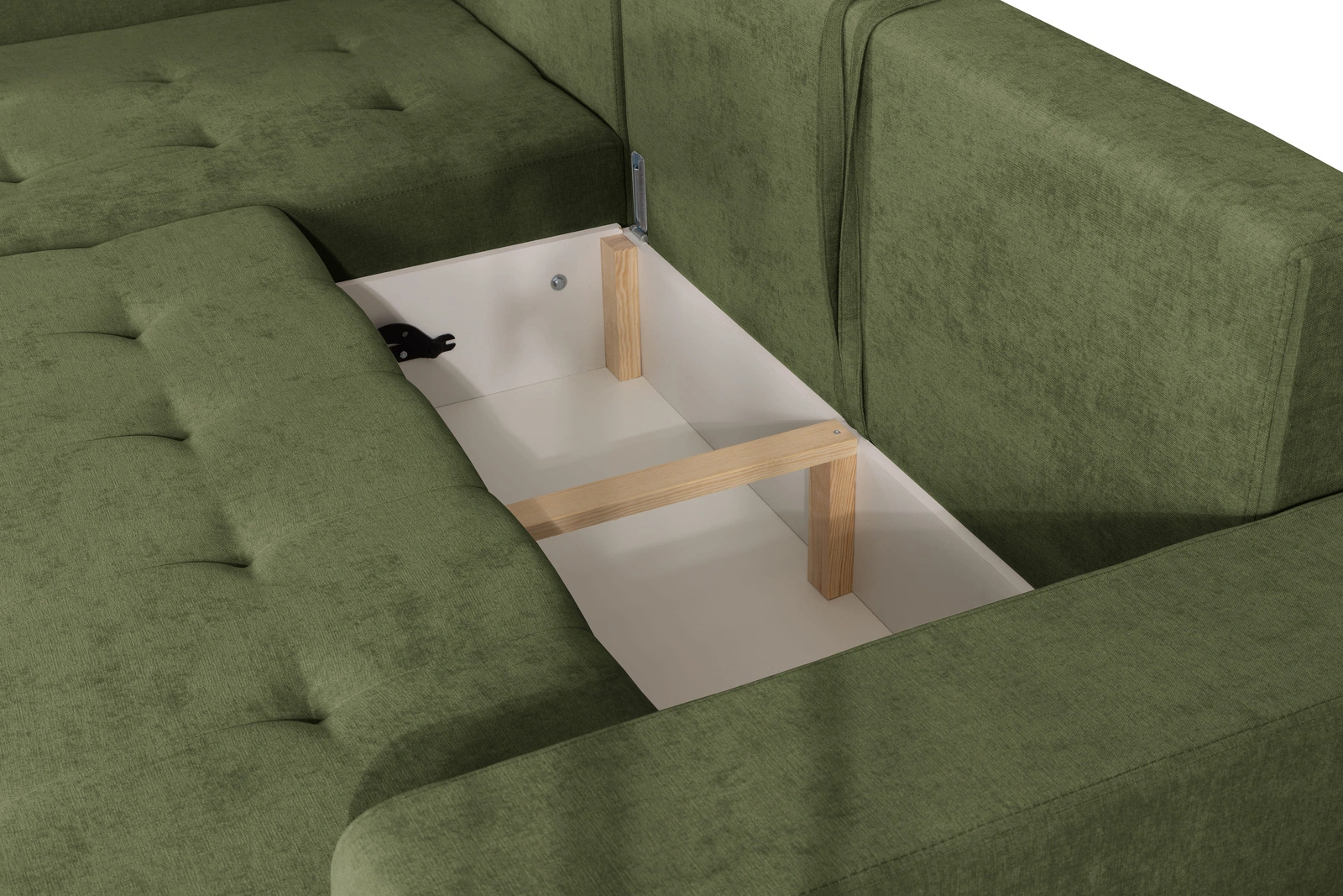 - Pojemnik na pościel: Obszerny schowek ukryty pod siedziskiem to idealne miejsce na przechowywanie tekstyliów.