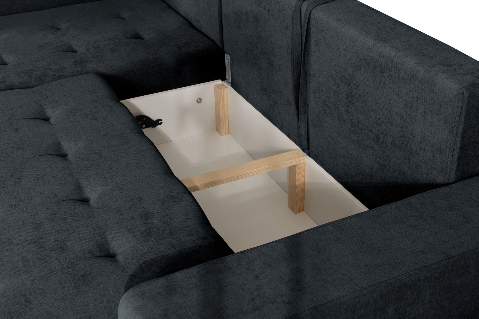 - Pojemnik na pościel: Ukryty schowek pod siedziskiem to idealne miejsce na pościel lub rzadziej używane rzeczy.