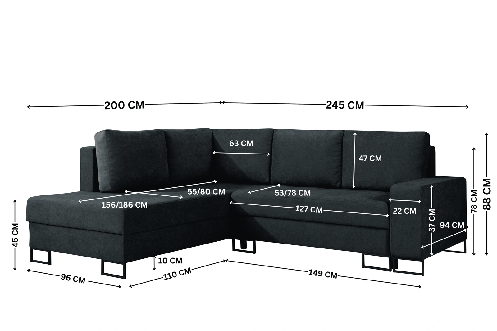 - Narożnik TREVI (Wind 99, czarny) to loftowy charakter w rozmiarze 245x200 cm. Funkcja spania (206x122 cm) i pojemnik. Tkanina szenilowa o strukturze lnu w kolorze głębokiej czerni. Metalowe nóżki i ozdobne przeszycia.
