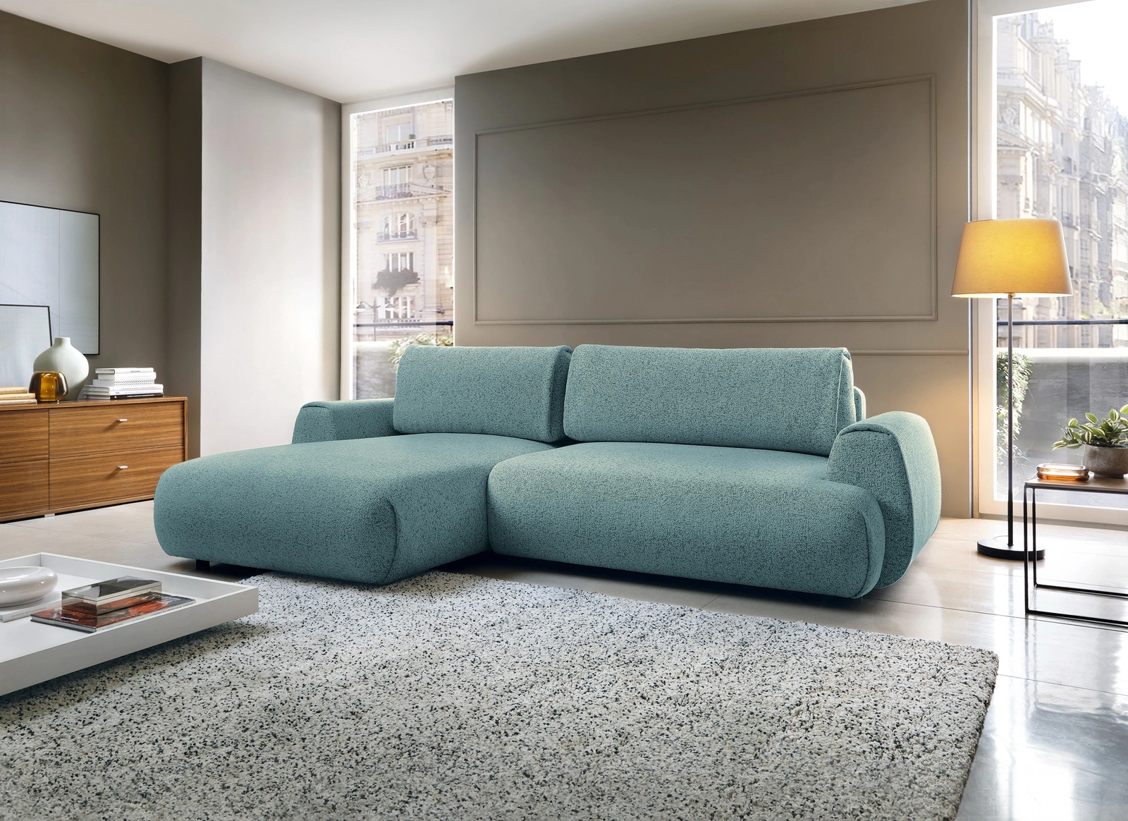 - Narożnik VERNIO (Puente 73, lazur) to energia we wnętrzu. Wersja lewostronna z funkcją spania i pojemnikiem. Tkanina z dodatkiem bawełny w odcieniu oceanicznego błękitu. Wymiary: 270x167 cm.