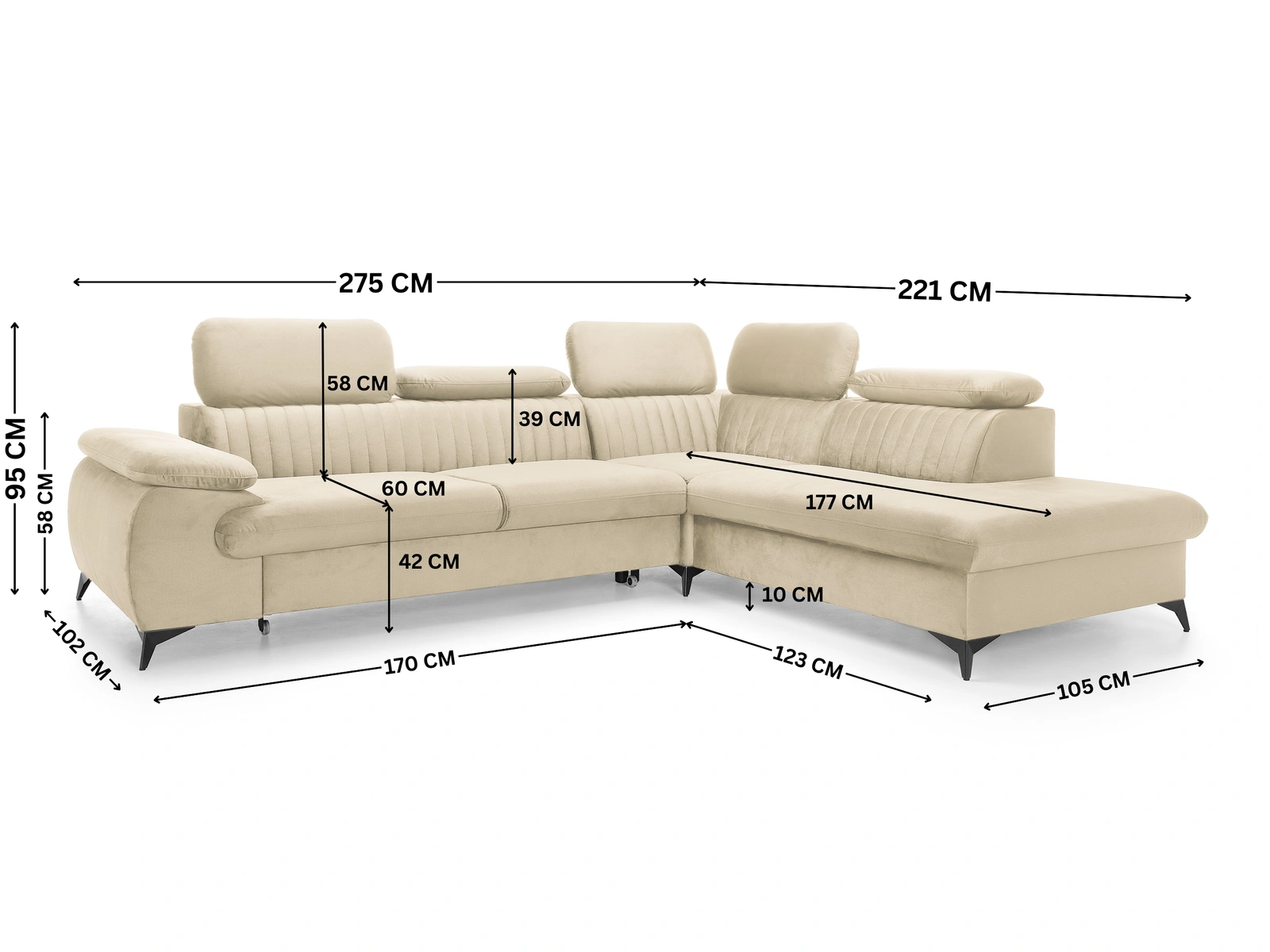 - Narożnik VETTO (Monolith 02, ecru) to luksusowy welurowy mebel o wymiarach 275x221 cm. Posiada regulowane zagłówki, funkcję spania i pojemnik. Tkanina hydrofobowa Water Repellent ułatwia czyszczenie. Czarne, metalowe nóżki.