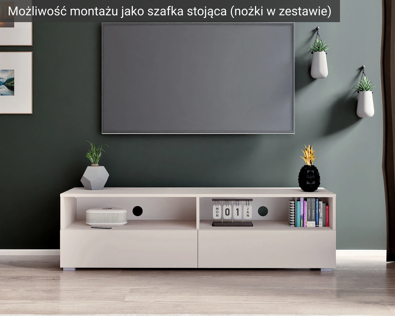 • Szafka RTV Tebris Dual 300 – dwa moduły po 150 cm w białym macie. Aż 4 klapy, 4 półki i 4 otwory na kable. Idealna do dużych przestrzeni i rozbudowanych stref multimedialnych.