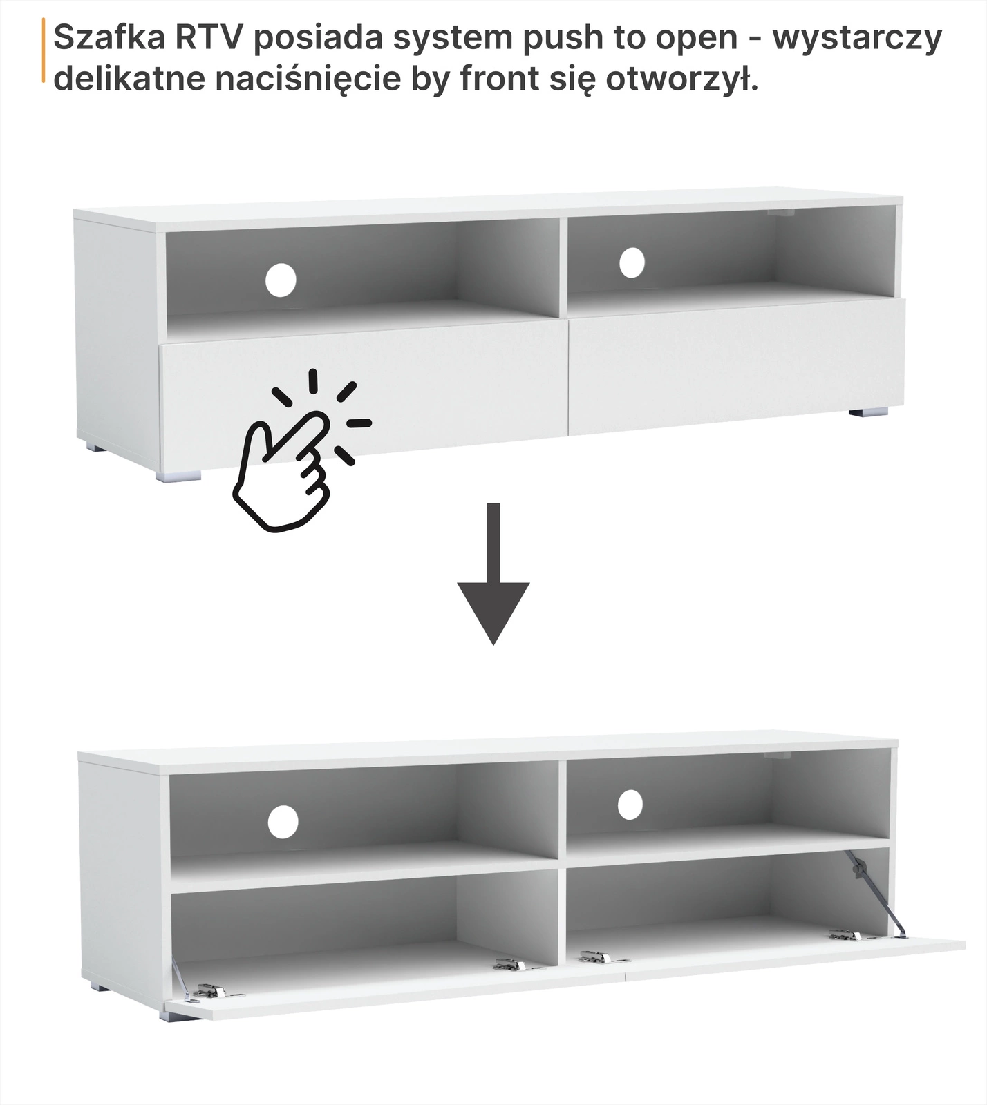 Nowoczesny zestaw RTV Tebris Dual 300 – biały mat, 2 szafki 150 cm z push to open
