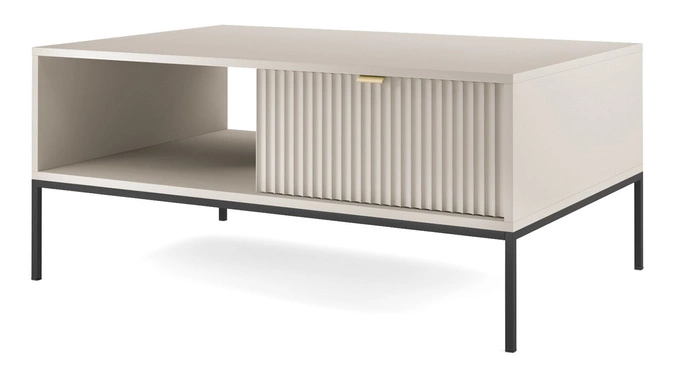 - Stylowy stolik kawowy Kioto o długości 104 cm w eleganckim, kolorze cashmere to idealny mebel, który doda wyjątkowego uroku w Twoim salonie. Wyposażona w dwie praktyczne szuflady ława łączy w sobie funkcjonalność z nowoczesnym designem.