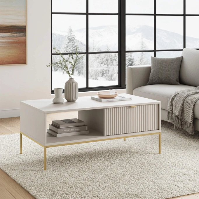 - Stylowy stolik kawowy Kioto o długości 104 cm w eleganckim, kolorze cashmere to idealny mebel, który doda wyjątkowego uroku w Twoim salonie. Wyposażona w dwie praktyczne szuflady ława łączy w sobie funkcjonalność z nowoczesnym designem.