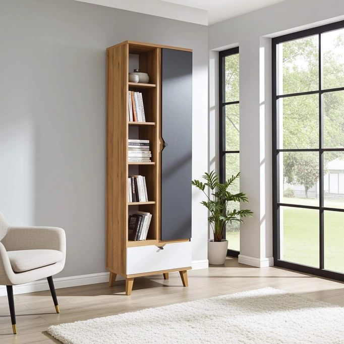 - Praktyczny regał na książki i dekoracje w kolorze Dąb Złoty / Grafit + Biały szerokość 60 cm – idealna do salonu, biura lub pokoju młodzieżowego, doda stylu i funkcjonalności Twojemu wnętrzu.