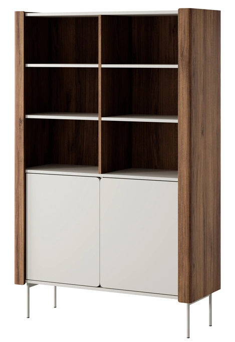 - Wysoki regał z zaokrąglonymi bokami w dekorze orzecha warmia i frontami w kolorze kaszmiru. Otwarta część z półkami na ekspozycję, dolna zamykana na przechowywanie. Nowoczesna forma na smukłych nóżkach.