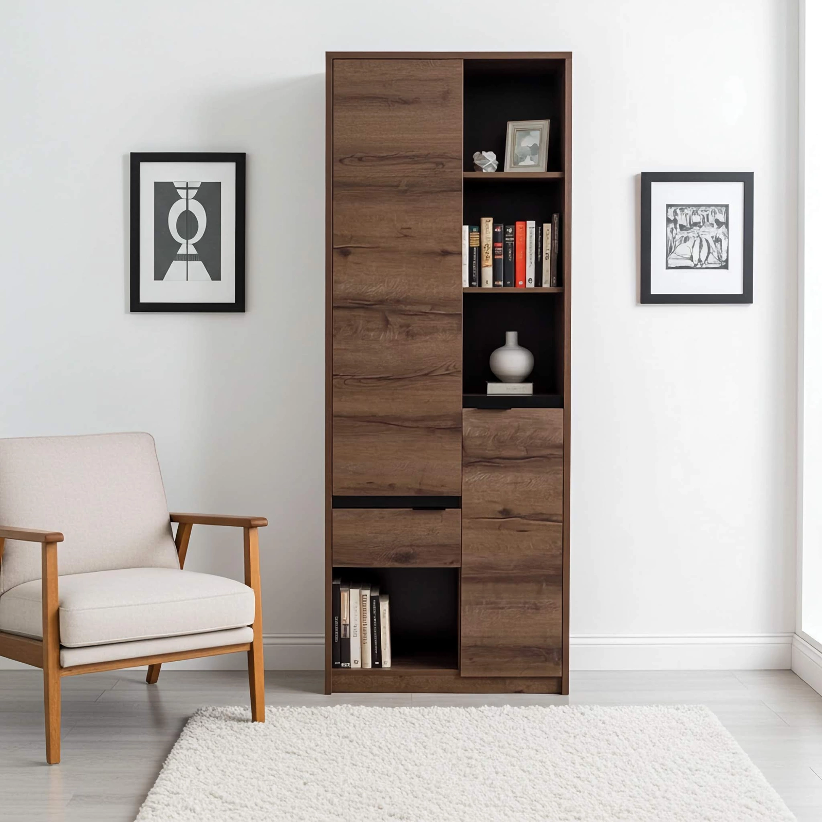 - Praktyczny regał na książki i dekoracje w kolorze Dąb Monastery / Czarny Połysk szerokość 80 cm – idealny do salonu, biura lub pokoju młodzieżowego, to świetny wybór dla miłośników stylowych mebli.
