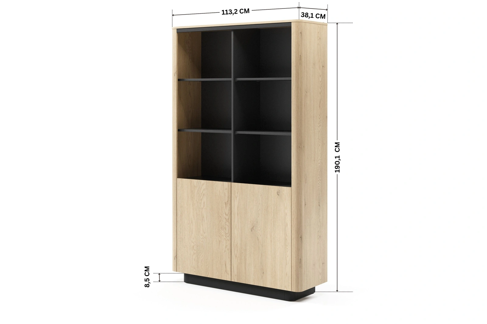 Regał z kolekcji TORRO to mebel o unikalnym designie, który łączy ciepło dekoru Dąb Cremona z elegancją czarnych dodatków. Mebel o szerokości 113,2 cm i wysokości 190,1 cm stanowi doskonałe miejsce do eksponowania książek i dekoracji oraz przechowywania rzeczy osobistych.