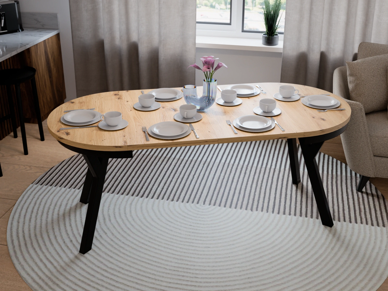 - Stół ARI w kolorze Dąb Artisan to idealny wybór do wnętrz w stylu loft i skandynawskim. Okrągły blat 90 cm z wyraźną strukturą drewna rozkłada się do 190 cm. Czarne, metalowe nogi zapewniają stabilność.