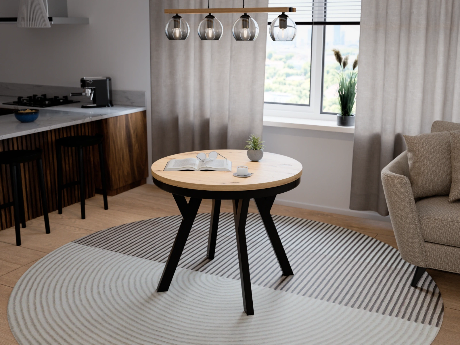 - Wersja złożona (Ø 90 cm) – kompaktowy, okrągły stół idealny do codziennych posiłków.