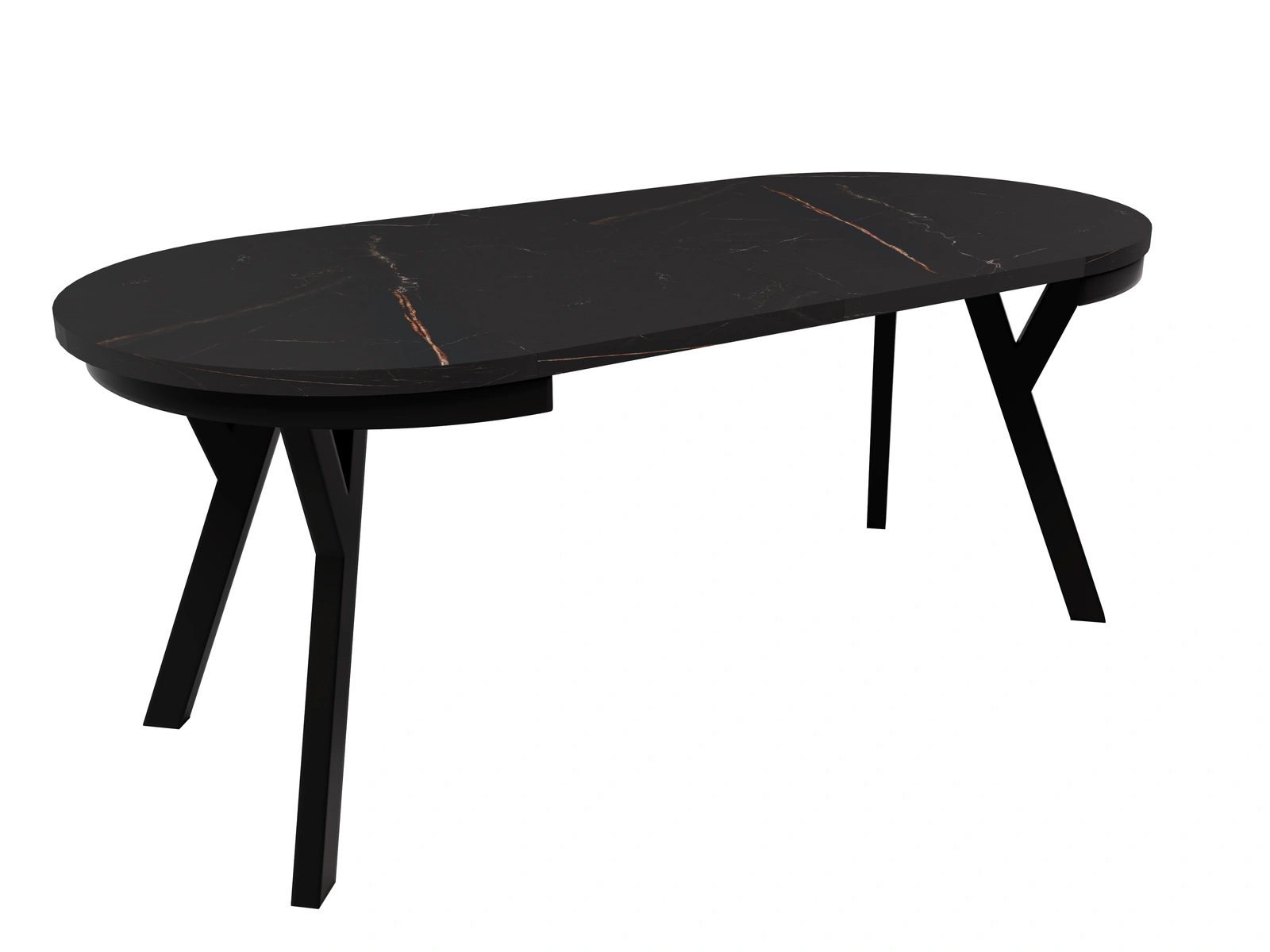 Stół ARI w wykończeniu Marmur San Sebastian to propozycja dla najbardziej wymagających. Ciemny blat imitujący szlachetny kamień, przecięty nieregularnymi, miedziano-złotymi żyłkami, przyciąga wzrok i stanowi główną ozdobę pomieszczenia. W połączeniu z czarną, metalową podstawą tworzy mebel idealny do wnętrz w stylu glamour, art déco oraz nowoczesnym.