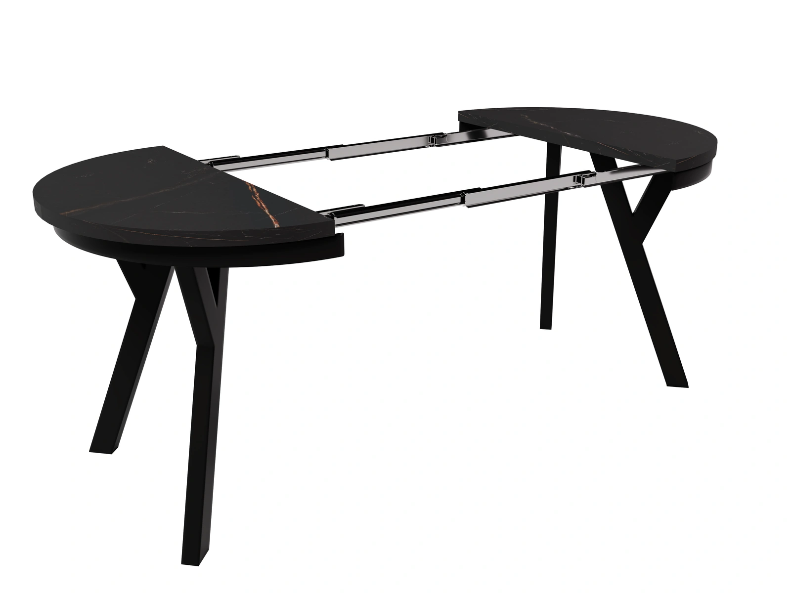 - Stół ARI w dekorze Marmur San Sebastian to kwintesencja elegancji. Czarny blat z efektownymi, miedzianymi żyłkami (90-190 cm) nadaje wnętrzu luksusowy charakter. Solidne, metalowe nogi trwałości. Idealny do jadalni w stylu glamour i modern loft.