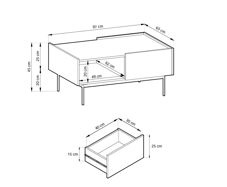 Wyposażony w dwie pojemne szuflady z pełnym wysuwem oraz praktyczną otwartą półkę, stolik pozwala wygodnie przechowywać piloty, gazety czy inne drobiazgi. Dzięki temu pomaga utrzymać porządek i estetykę w salonie. Smukłe, metalowe nóżki wprowadzają wizualną lekkość, a kompaktowa bryła świetnie sprawdzi się zarówno w nowoczesnych, jak i klasycznych aranżacjach.