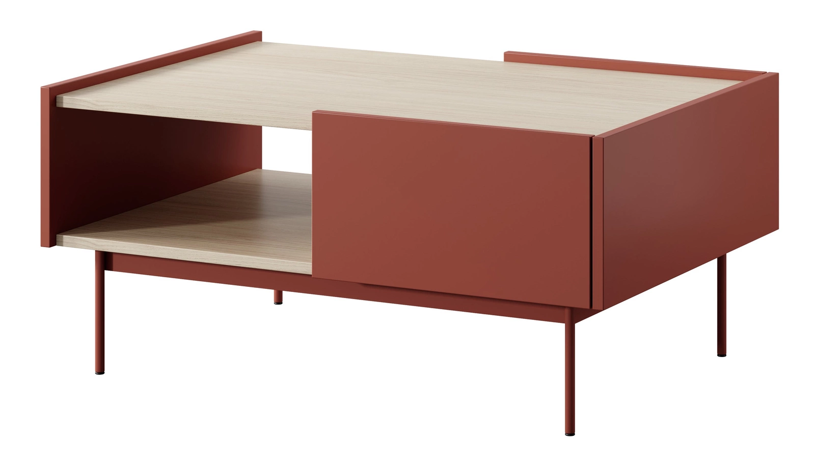 - Stolik kawowy w kolorze ceramic red z praktycznymi dwiema szufladami i odkrytą półką. Minimalistyczna forma, funkcjonalność i wyjątkowe połączenie matowej czerwieni z dekorem dębu linea.