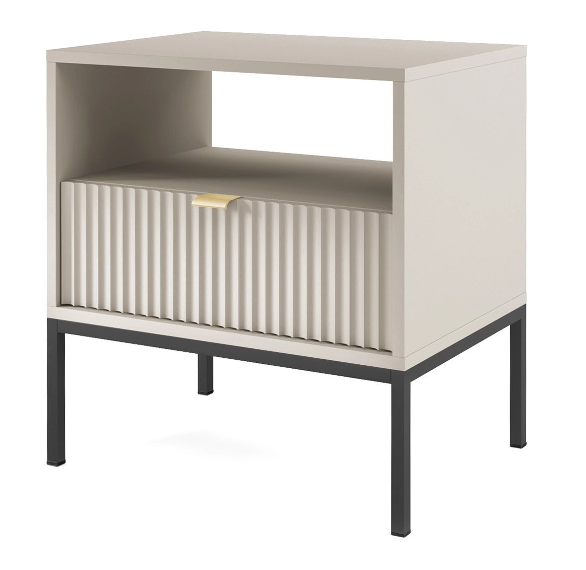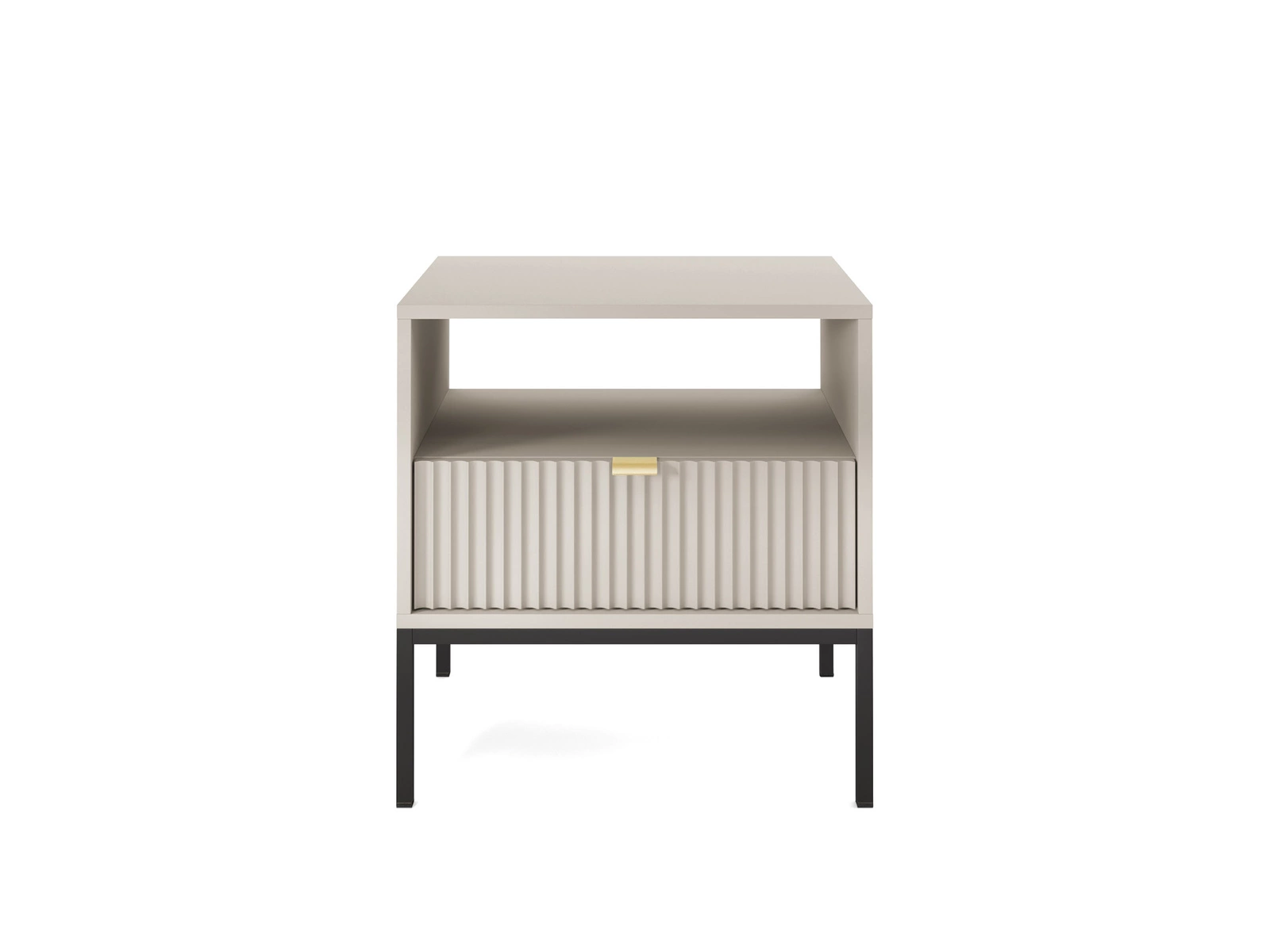 - Stylowy stolik nocny Kioto o szerokości 54 cm w eleganckim kolorze cashmere to doskonały dodatek do każdej sypialni. Jego ryflowany front 3D nadaje mu wyjątkowego charakteru, który podkreśla nowoczesny wygląd pomieszczenia.