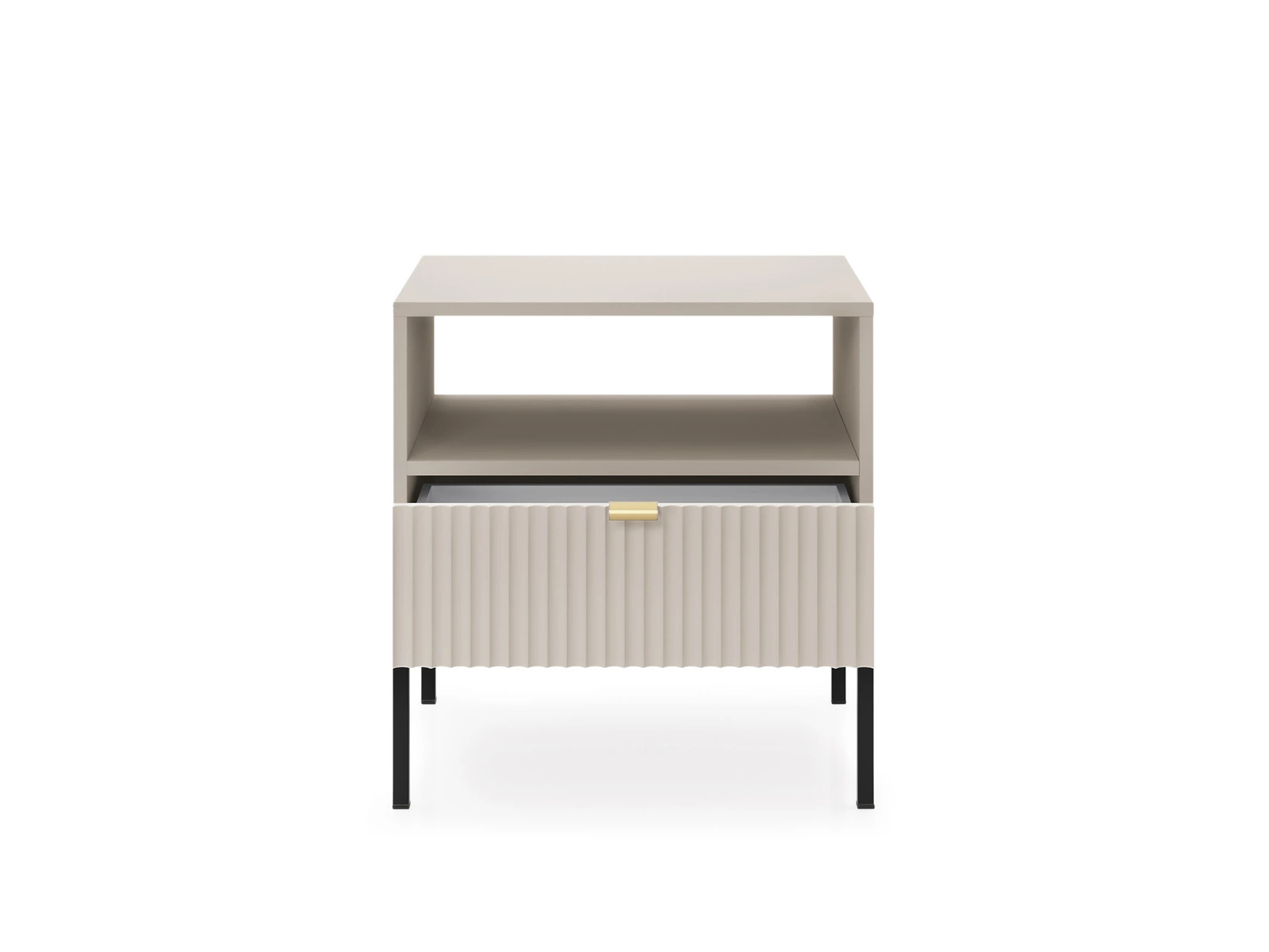 Ryflowany front w połączeniu ze złotym uchwytem nadaje temu stolikowi niepowtarzalny styl. To mebel, który doskonale łączy dekoracyjność z funkcjonalnością – świetnie sprawdzi się jako miejsce na lampkę, książkę czy drobiazgi, które chcesz mieć zawsze pod ręką.