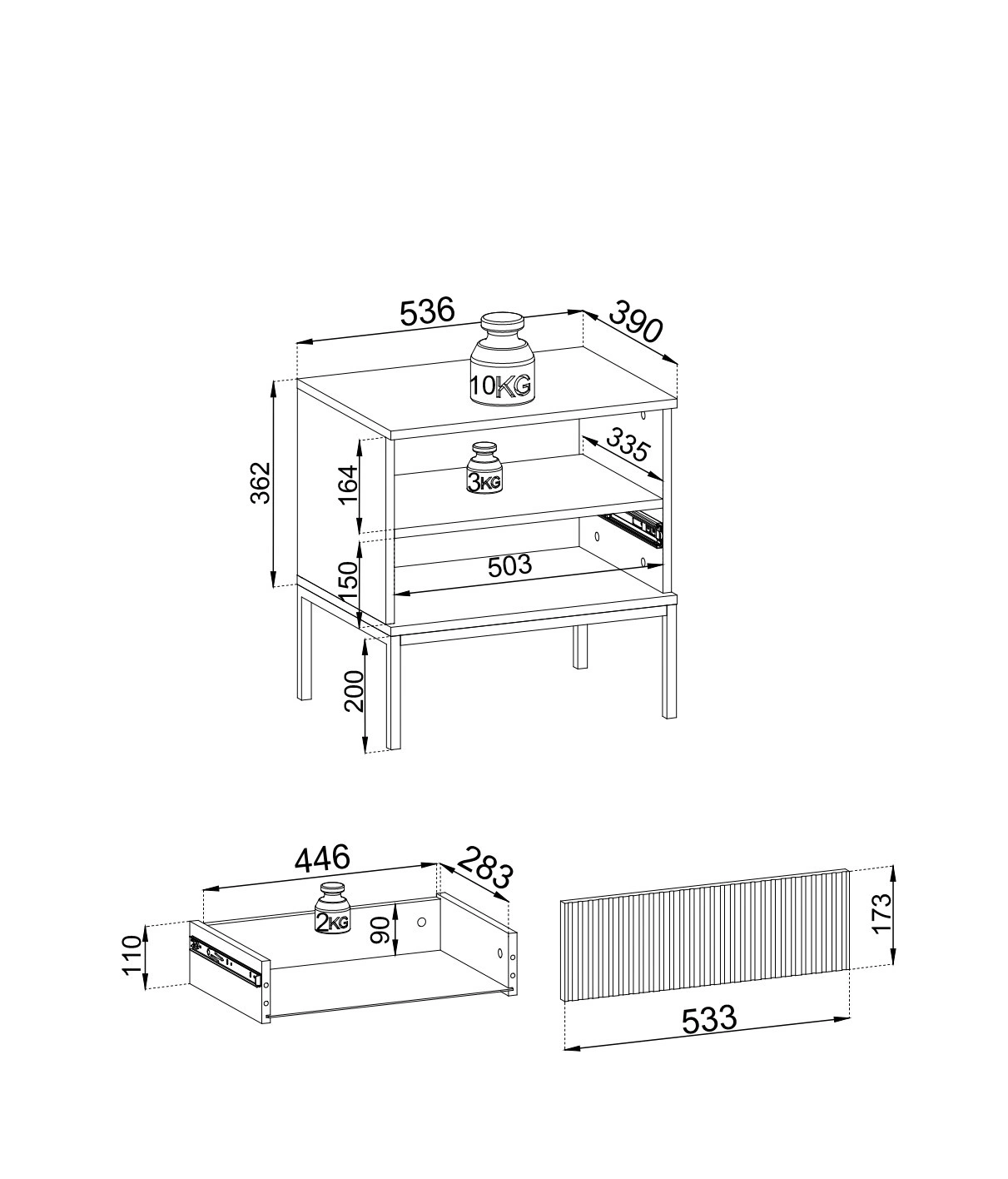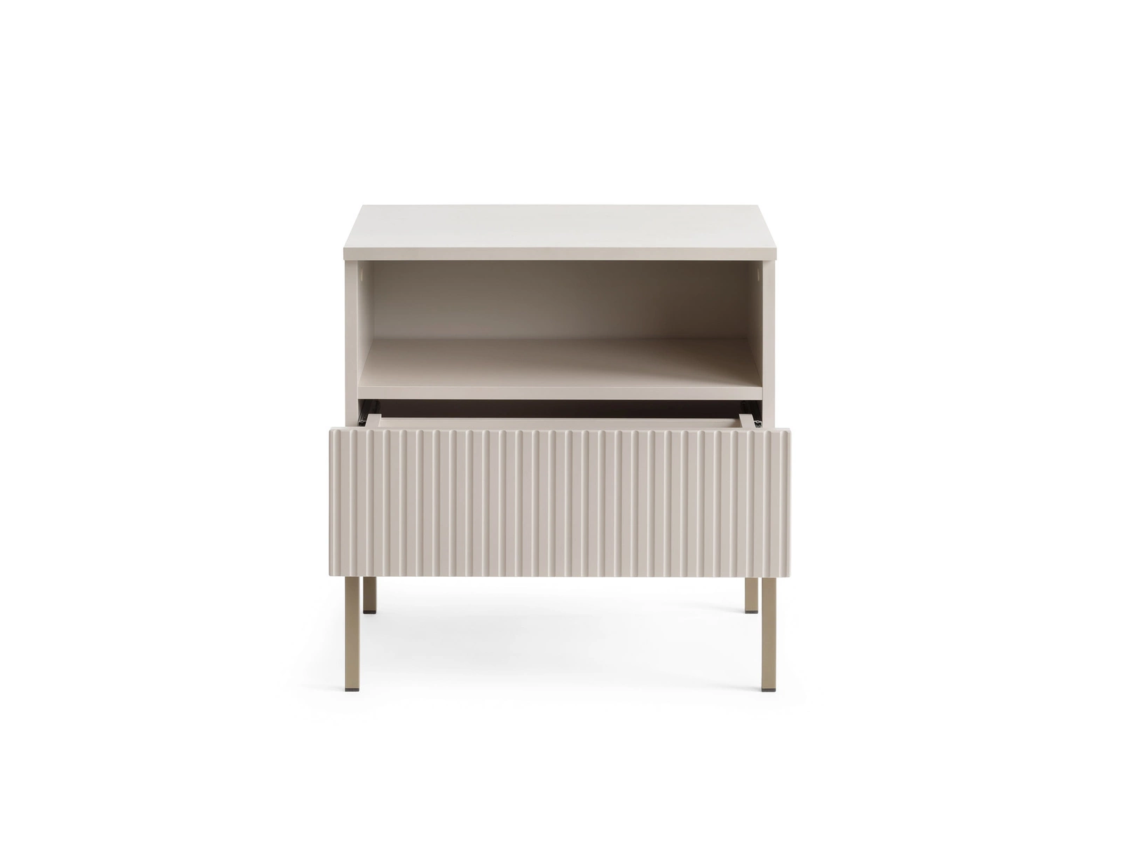 Stolik nocny w ciepłym kolorze kaszmiru przykuwa uwagę ryflowanym frontem szuflady, którego pionowe żłobienia nadają fakturze głębi i elegancji. Dyskretny pasek LED ukryty pod blatem subtelnie oświetla front, podkreślając jego relief i tworząc nastrojowe światło do wieczornej lektury. Pojemna, pełno-wysuwna szuflada na metalowych prowadnicach pomieści książki, ładowarki czy kosmetyki, a odporny na zarysowania blat bez problemu udźwignie kubek z herbatą czy budzik. Smukłe nogi z metalu dodają konstrukcji lekkości, wprowadzając szczyptę loftowego charakteru i ułatwiając sprzątanie pod meblem. Połączenie ryflowanego frontu, kaszmirowego matu i subtelnego podświetlenia sprawia, że stolik staje się nie tylko praktycznym, lecz także dekoracyjnym akcentem współczesnej sypialni.