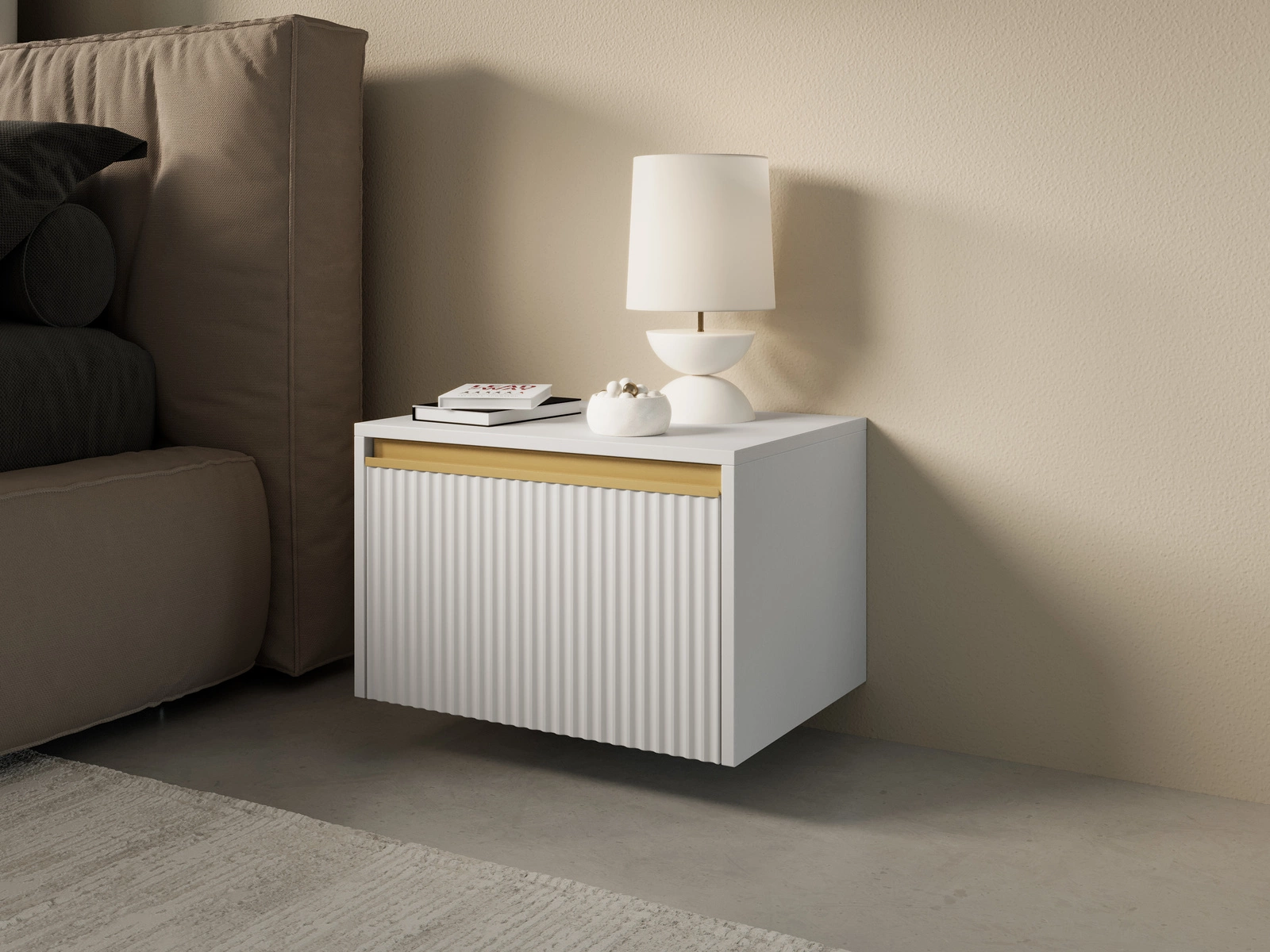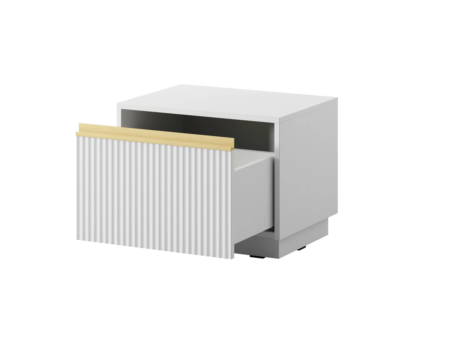 • Stolik nocny Loren z frezowanym frontem i złotym detalem. Pojemna szuflada zapewnia wygodne przechowywanie przy łóżku. Idealny do nowoczesnych wnętrz.