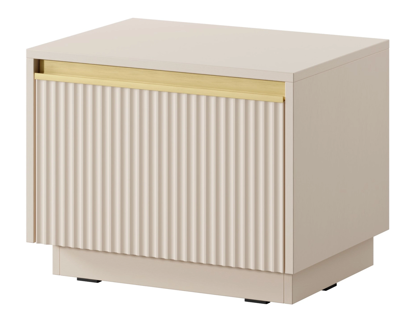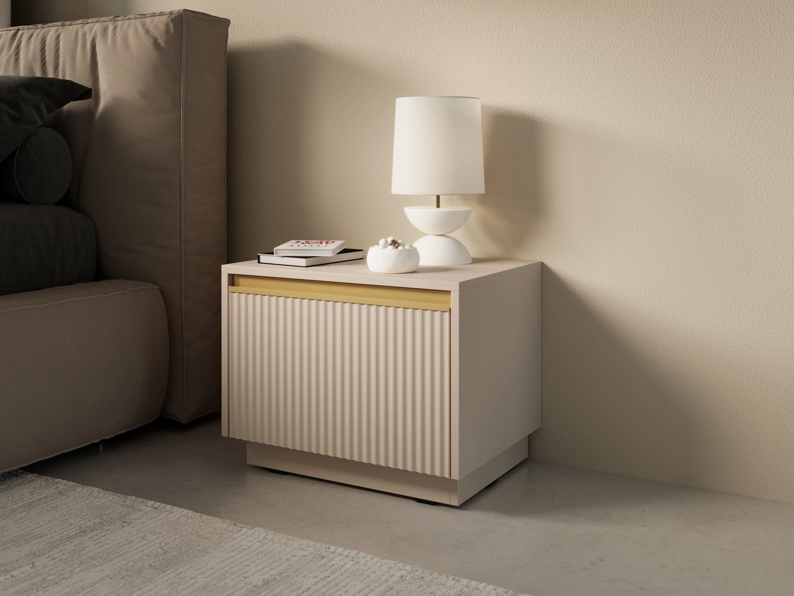 - Stolik nocny Loren z frezowanym frontem i złotym detalem. Pojemna szuflada zapewnia wygodne przechowywanie przy łóżku. Idealny do nowoczesnych wnętrz.