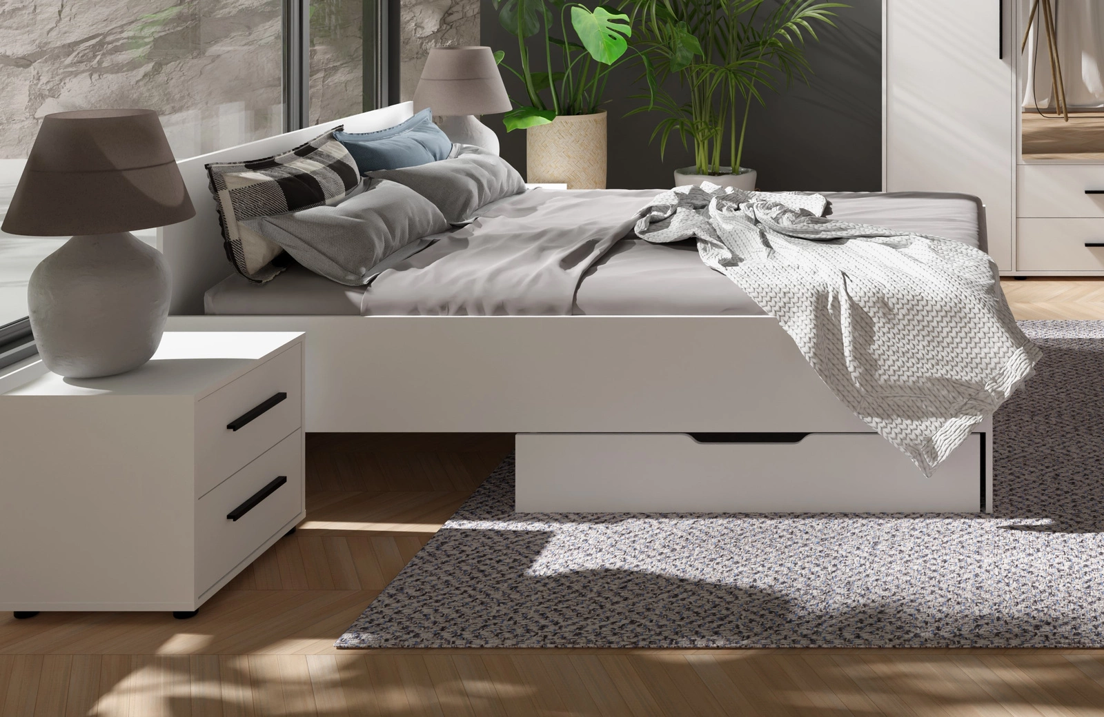 Szafka nocna Modena w kolorze biały mat to praktyczny i stylowy element wyposażenia każdej sypialni. Jej prosta, nowoczesna forma doskonale komponuje się zarówno z jasnymi, skandynawskimi aranżacjami, jak i z kontrastowymi, loftowymi wnętrzami. Matowe wykończenie frontów w połączeniu z czarnymi uchwytami tworzy elegancki i ponadczasowy duet.