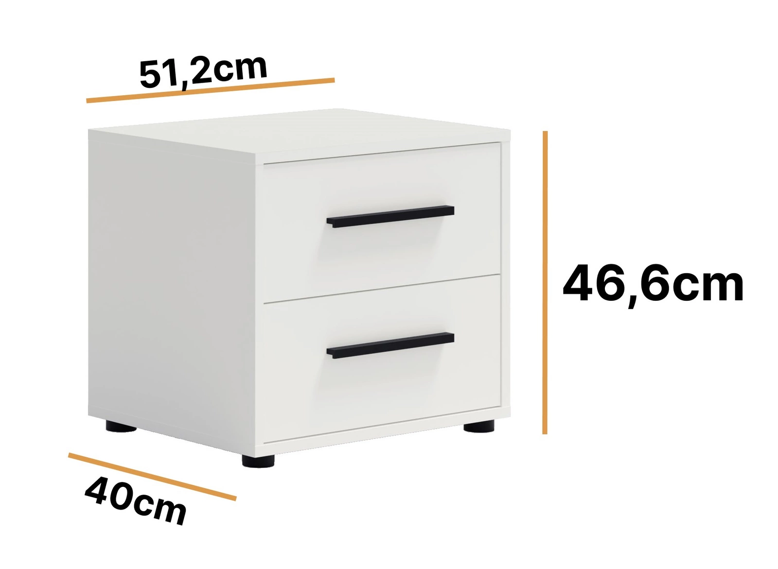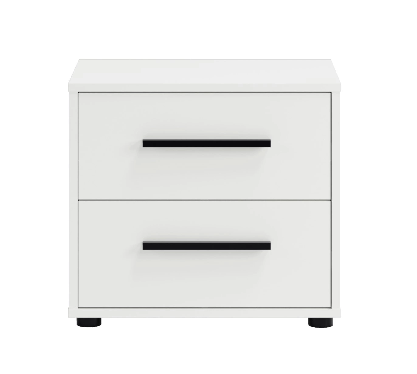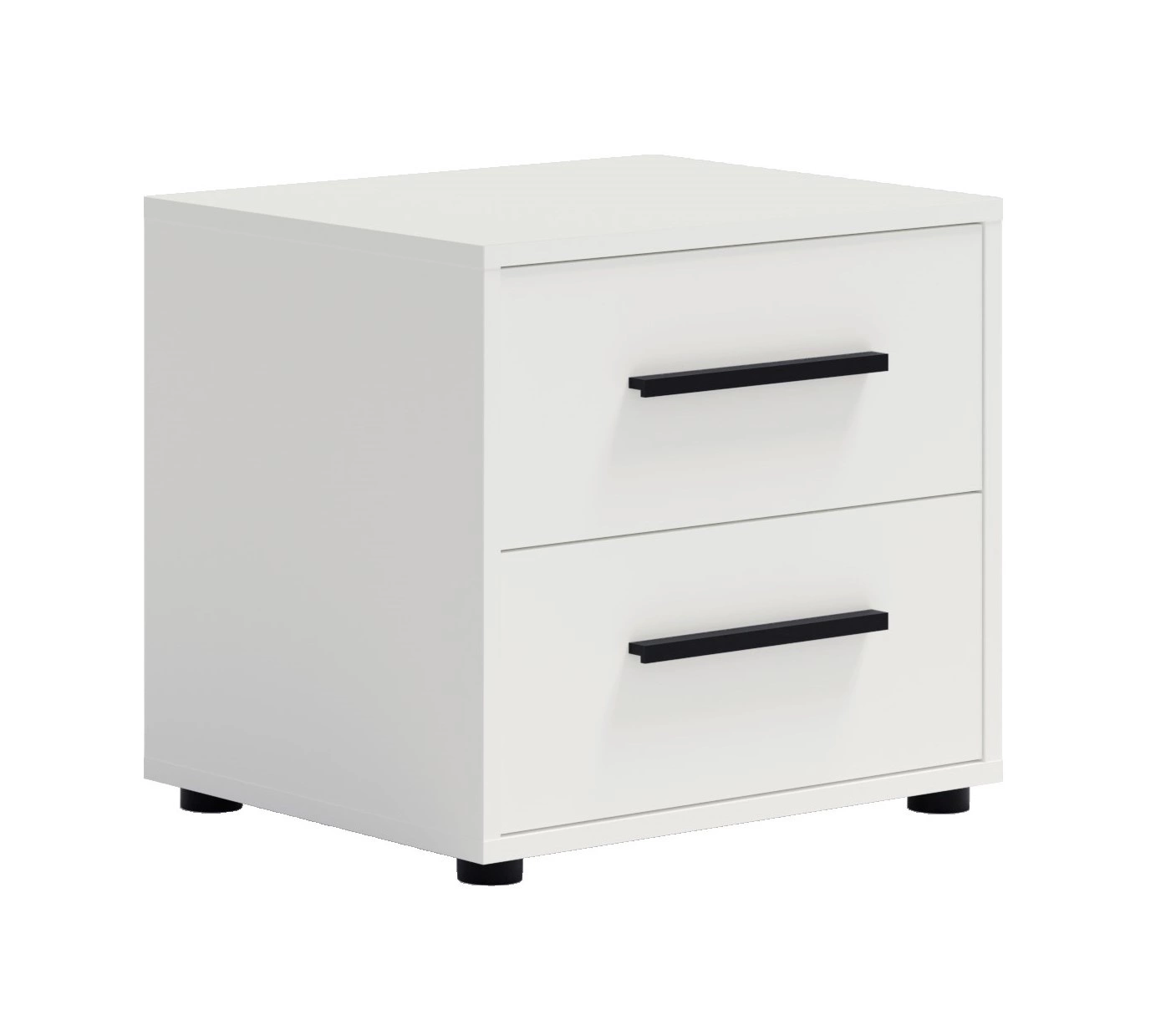 • Szafka nocna Modena biały mat, 2 szuflady, czarne uchwyty. Minimalistyczna, pojemna i stylowa – idealna do nowoczesnej sypialni.