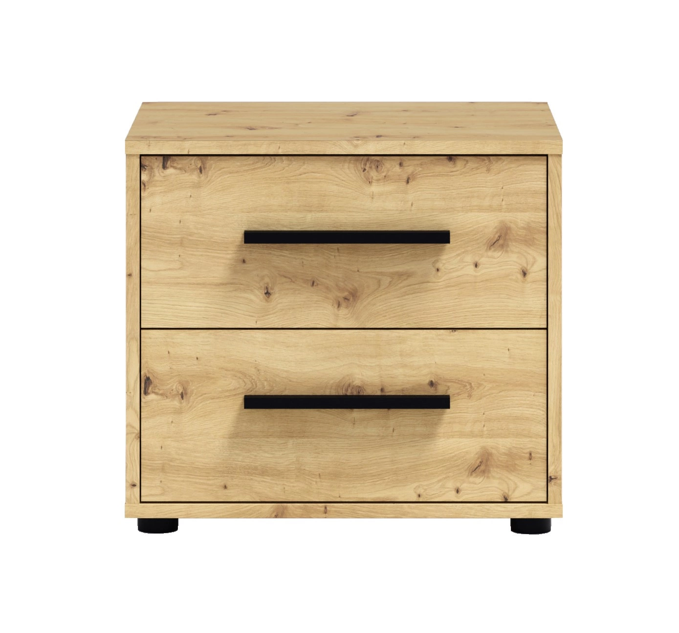 • Szafka nocna Modena dąb artisan, 2 szuflady, czarne uchwyty. Minimalistyczna, pojemna i stylowa – idealna do nowoczesnej sypialni.
