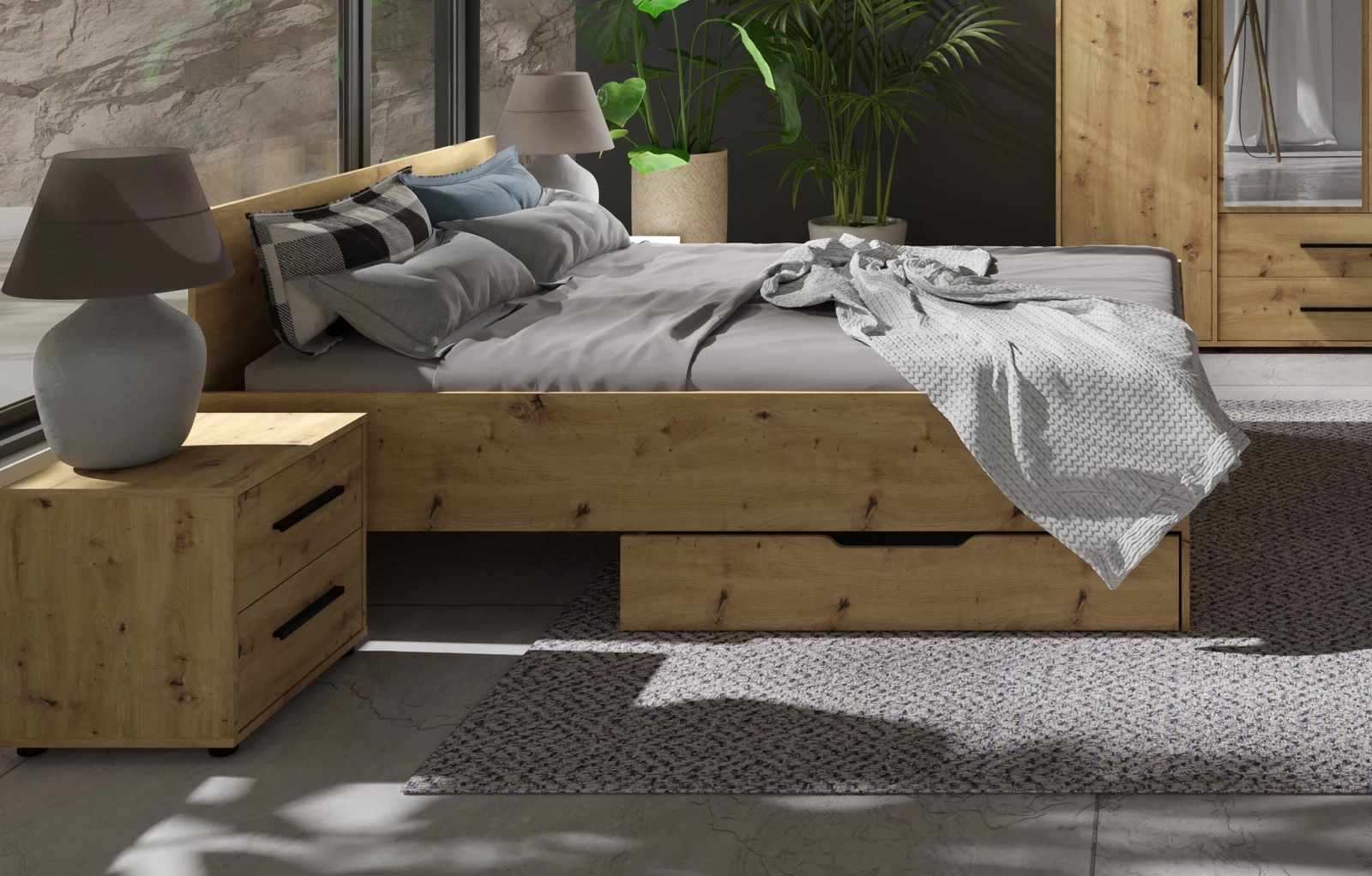 Szafka nocna Modena w kolorze dąb artisan to praktyczny i stylowy element wyposażenia każdej sypialni. Jej prosta, nowoczesna forma doskonale komponuje się zarówno z jasnymi, skandynawskimi aranżacjami, jak i z kontrastowymi, loftowymi wnętrzami.