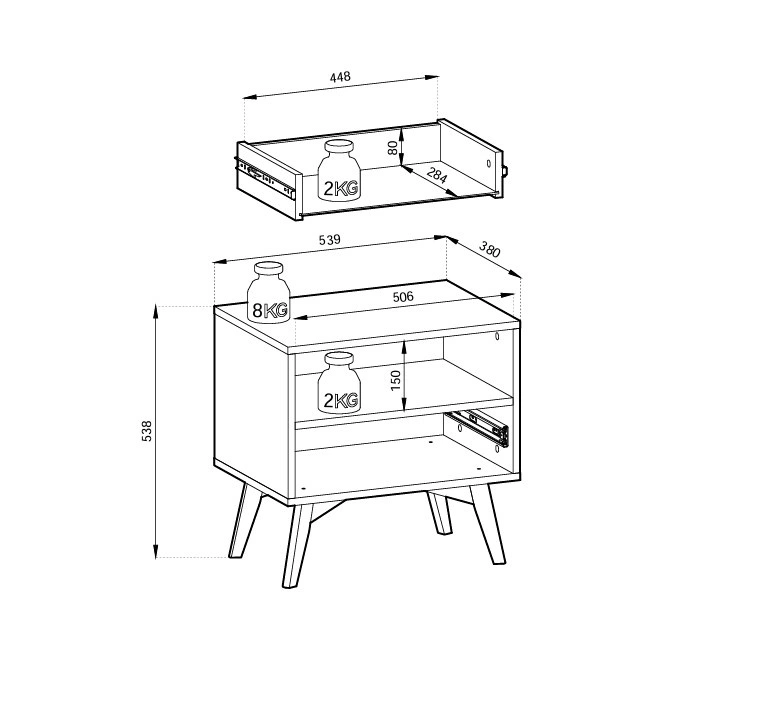 - Korpus oraz front wykonane z płyty laminowanej 16 mm