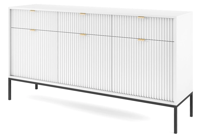 • Komoda o szerokości 154cm posiada ryflowany front co dodaje niepowtarzalnego, nowoczesnego charakteru, który z pewnością przyciągnie Twoją uwagę. Złote uchwyty ze szczotkowanego aluminium stanowią elegancki akcent, podkreślając luksusowy wydźwięk mebla.