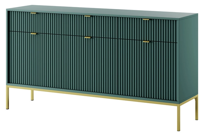 - Komoda o szerokości 154cm posiada ryflowany front co dodaje niepowtarzalnego, nowoczesnego charakteru, który z pewnością przyciągnie Twoją uwagę. Złote uchwyty ze szczotkowanego aluminium stanowią elegancki akcent, podkreślając luksusowy wydźwięk mebla.