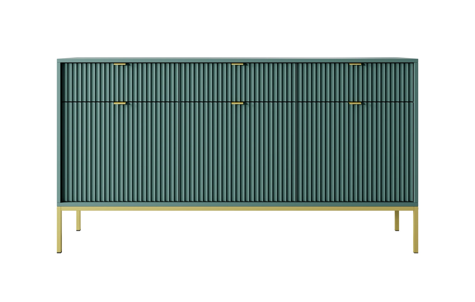 Zielona komoda Kioto to elegancki i funkcjonalny mebel, który wprowadzi świeżość do każdego wnętrza. Ryflowane fronty z MDF w głębokim odcieniu zieleni idealnie współgrają ze złotymi uchwytami i metalowym stelażem, tworząc nowoczesną, a zarazem przytulną kompozycję.