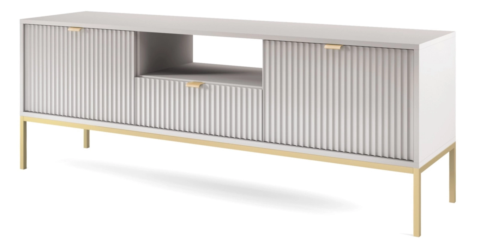 Ryflowany front szafki RTV Kioto to detal, który przyciąga wzrok i nadaje meblowi unikalnego charakteru. Złote uchwyty ze szczotkowanego aluminium podkreślają elegancki styl, a całość uzupełnia subtelne, matowe wykończenie.