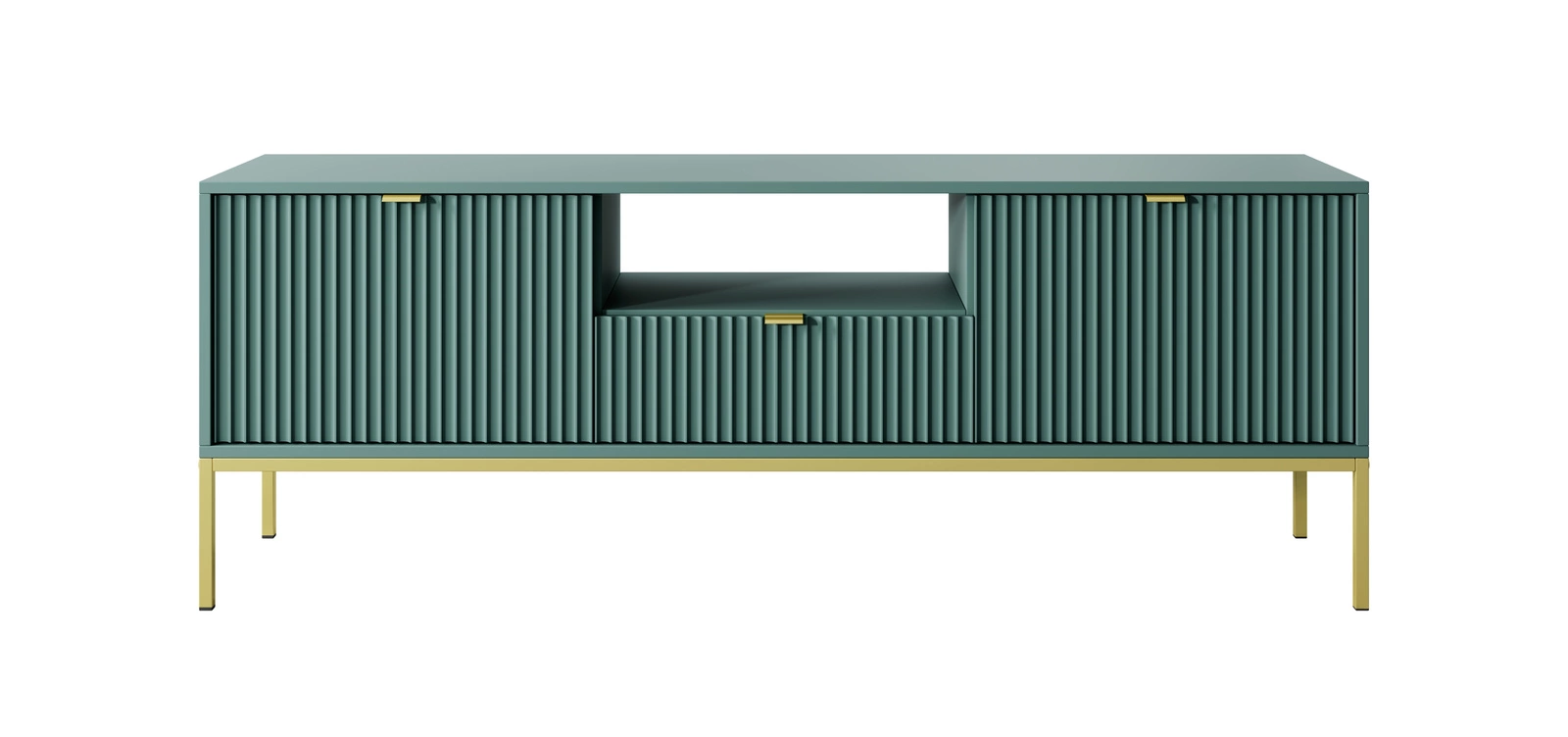 - Szafka RTV Kioto o szerokości 154 cm w kolorze zielonym to nie tylko mebel, ale prawdziwa ozdoba każdego nowoczesnego salonu. Wyposażona w dwa elegancko ryflowane drzwi i jedną praktyczną szufladę, ta szafka RTV łączy w sobie funkcjonalność z estetyką.