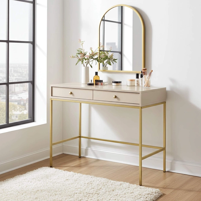 Stylowa toaletka Bari z dwoma szufladami beżowa + złote nóżki