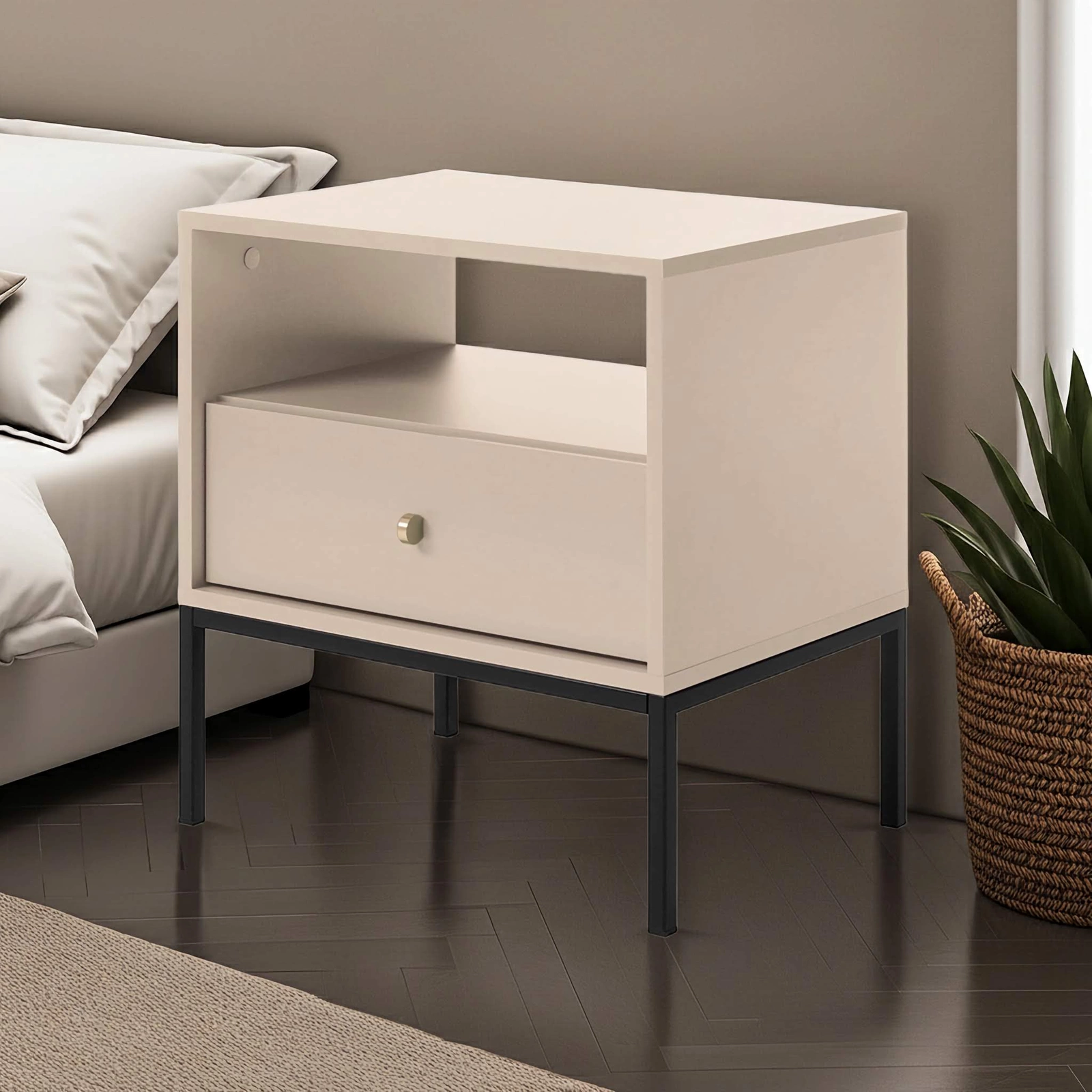 - Stolik nocny Bari w beżowym odcieniu to nie tylko praktyczne rozwiązanie dla Twojej sypialni, ale także elegancki element wystroju wnętrza. Wyposażona w jedną szufladę, ta szafka nocna umożliwia przechowywanie niezbędnych przedmiotów w zasięgu ręki.