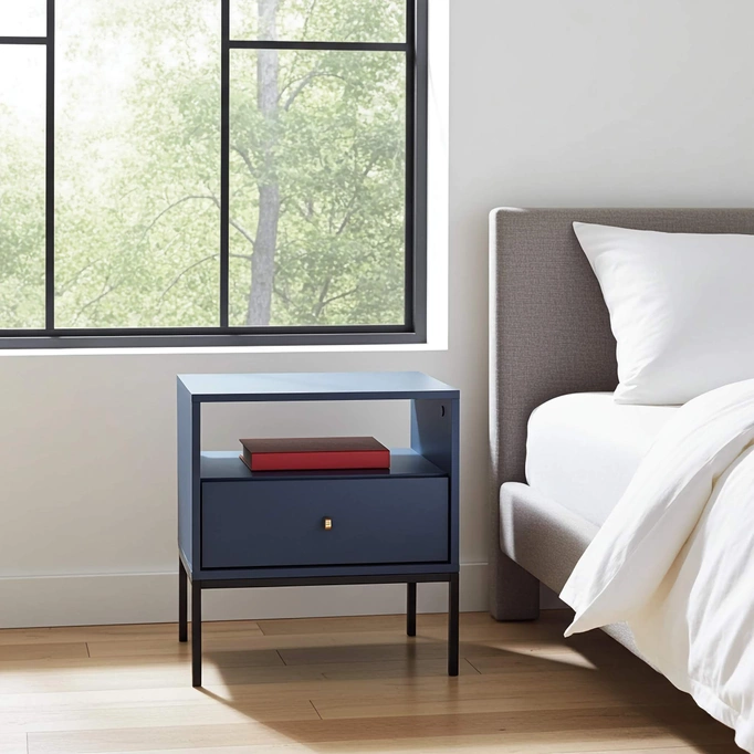 - Stolik nocny Bari w głębokim granatowym kolorze to doskonałe rozwiązanie, które doda elegancji i funkcjonalności Twojej sypialni. Wyposażony w jedną pojemną szufladę, ten stolik nocny umożliwia przechowywanie niezbędnych przedmiotów w zasięgu ręki.