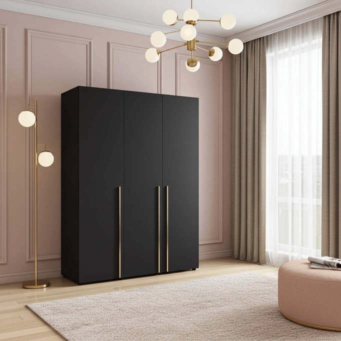 - Elegancka szafa ARNI 150 cm w czerni to idealny wybór do wnętrz w stylu loft i modern. Matowe wykończenie i prosta, trzydrzwiowa bryła nadają jej nowoczesnego charakteru. Wnętrze wyposażone w drążek i liczne półki pozwala na wygodną organizację ubrań.