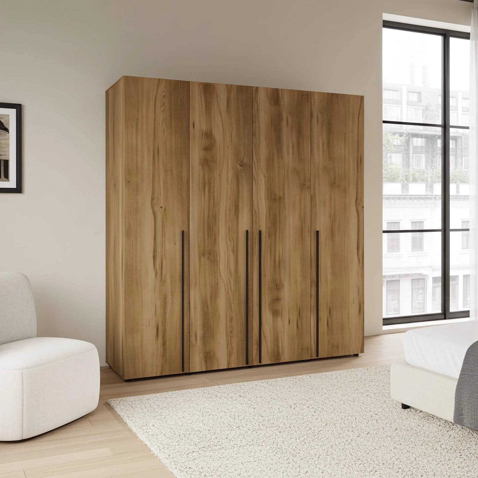 Czterodrzwiowa szafa ARNI w kolorze Gold Baroque to idealna propozycja dla osób, które chcą połączyć ogromną przestrzeń do przechowywania z ciepłym, domowym designem. Dekor imitujący naturalne drewno o głębokim, brązowym odcieniu sprawia, że mebel wygląda szlachetnie i przytulnie, a kontrastowe czarne uchwyty wprowadzają nowoczesny akcent.