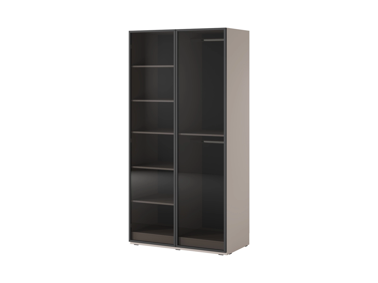 Dwumodułowa szafa 2x104 cm to nowoczesna kompozycja, która łączy elegancki wygląd z praktycznymi rozwiązaniami. Po jednej stronie znajdują się przeszklenia z przydymionego szkła Antisol, które pozwalają na subtelne wyeksponowanie zawartości. Z drugiej – pełne fronty w kolorze kaszmiru z pionowym frezowaniem, które nadają meblowi ciepła i struktury.