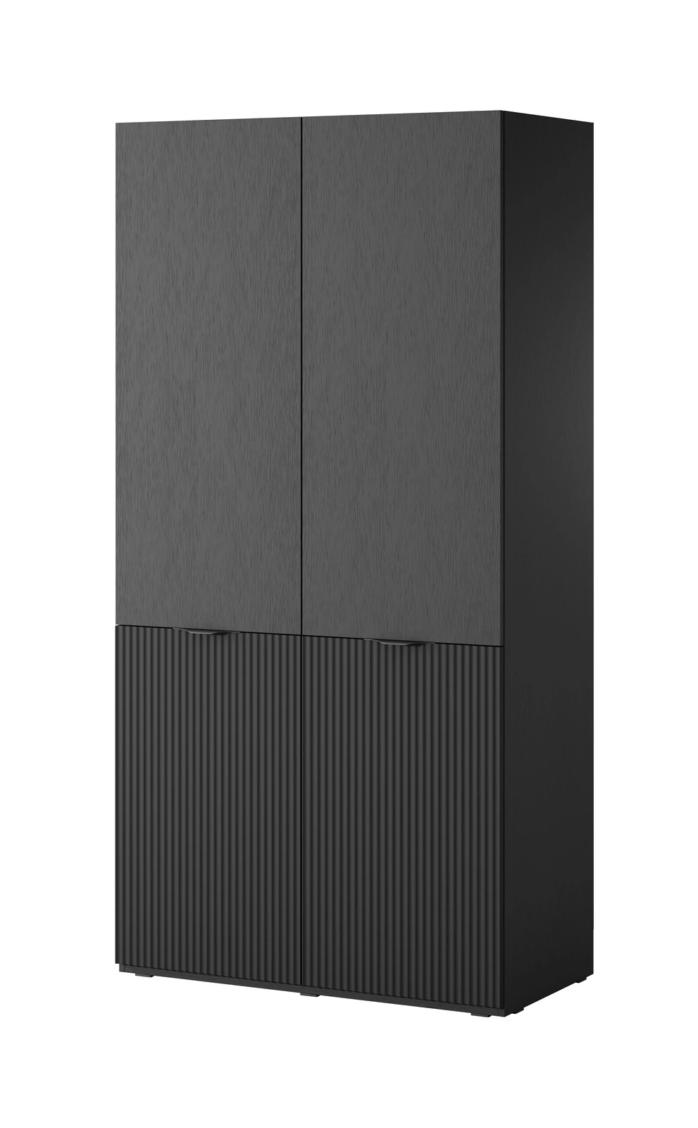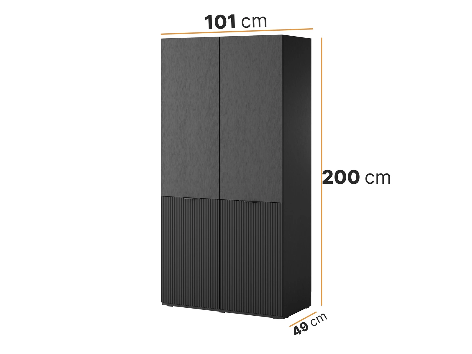 Szafa modułowa o szerokości 101 cm to połączenie eleganckiego designu i praktycznych rozwiązań do przechowywania. Gładkie, matowe fronty w odcieniu czarnym zostały przełamane frezowanym wykończeniem w dolnej części, co nadaje całości subtelnej głębi i nowoczesnego charakteru.