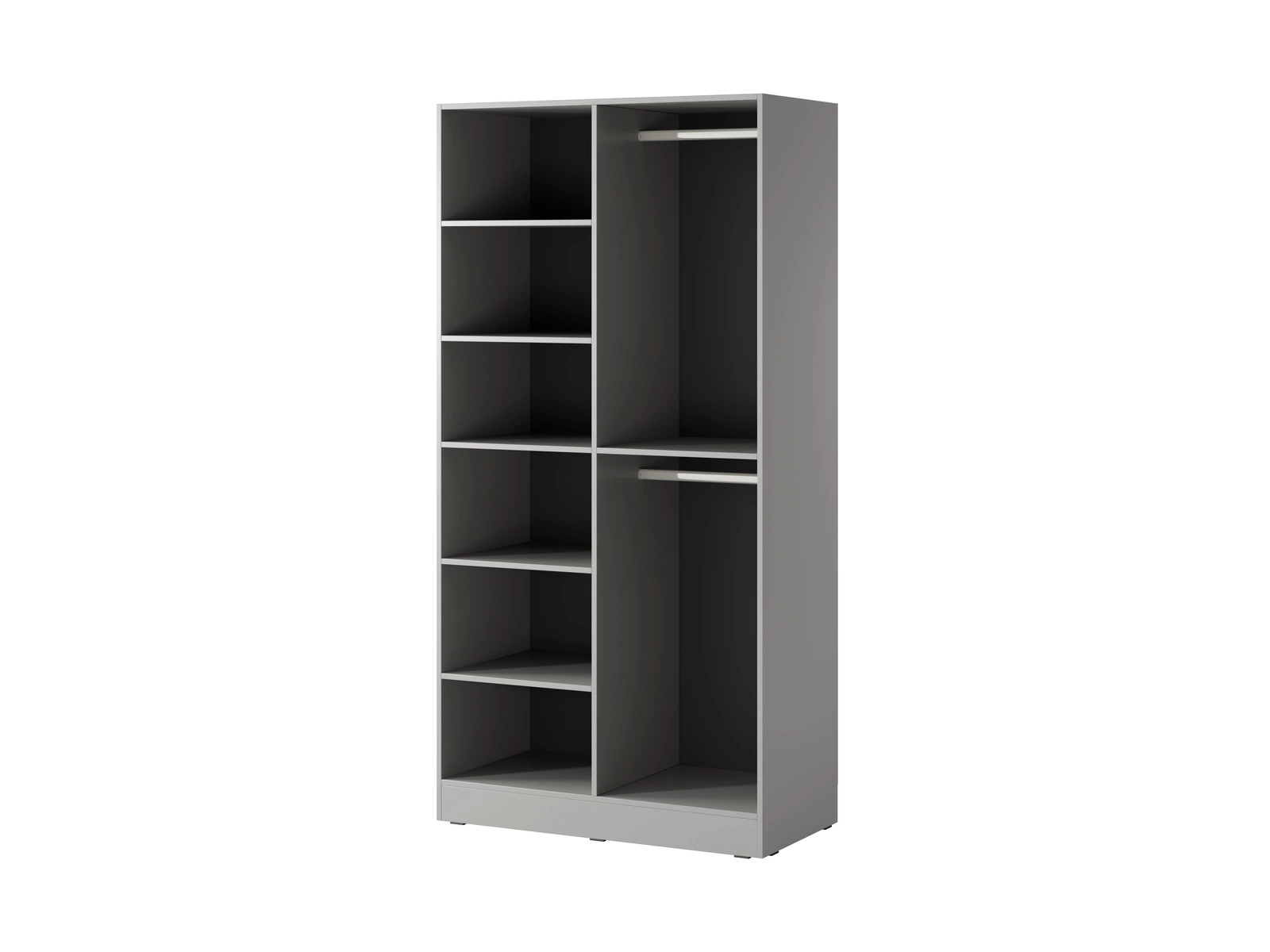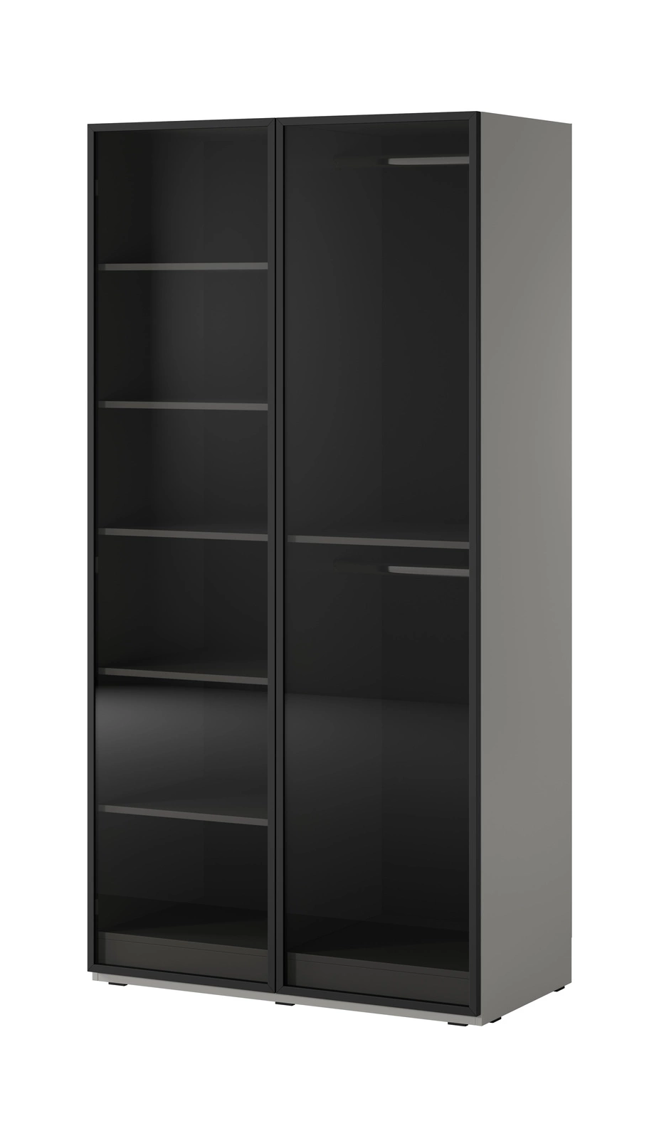 - Szafa modułowa 101 cm z przydymionym szkłem i szarym korpusem. Elegancka i pojemna – z półkami oraz podwójnym drążkiem. Idealna do nowoczesnej sypialni lub garderoby.