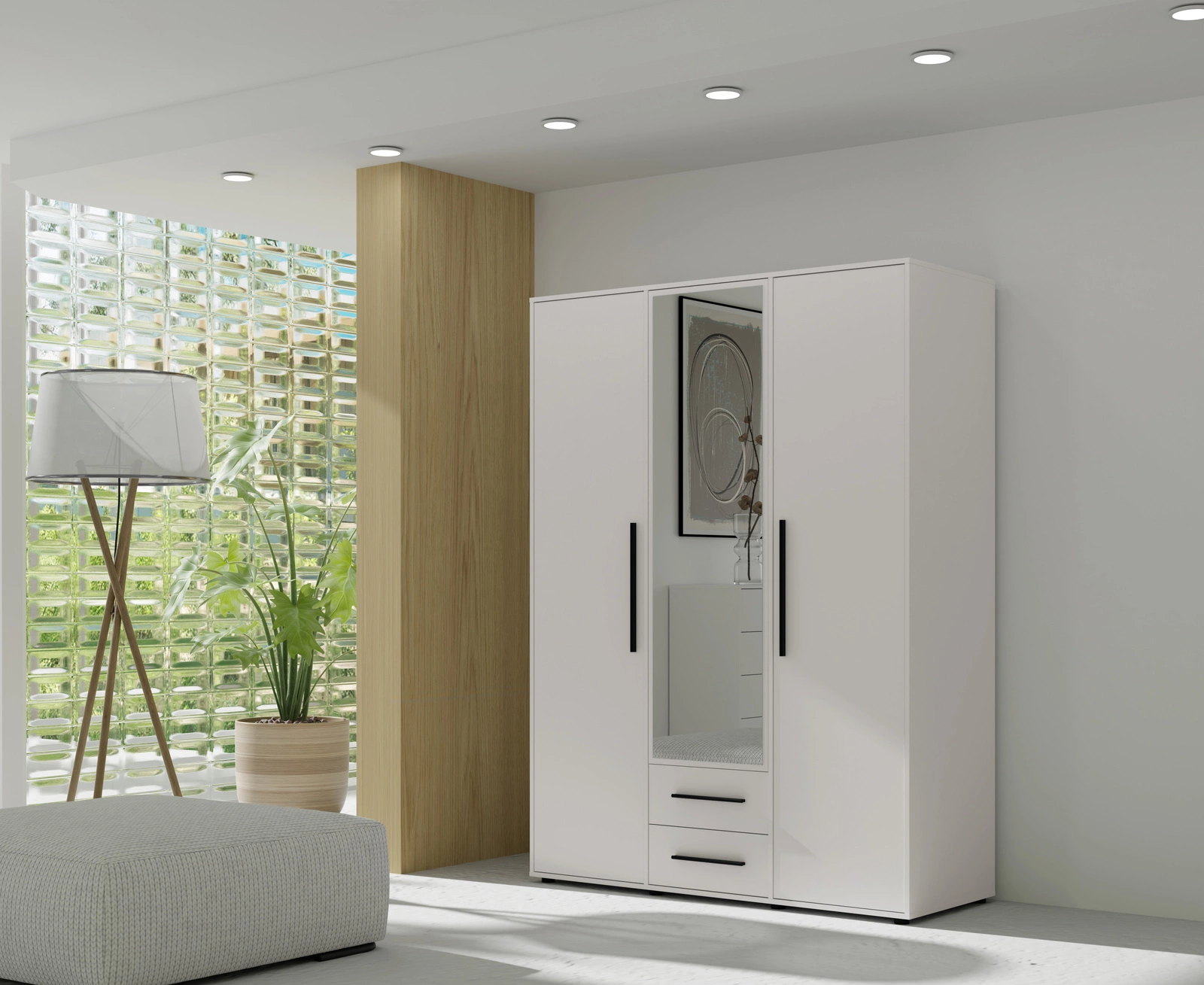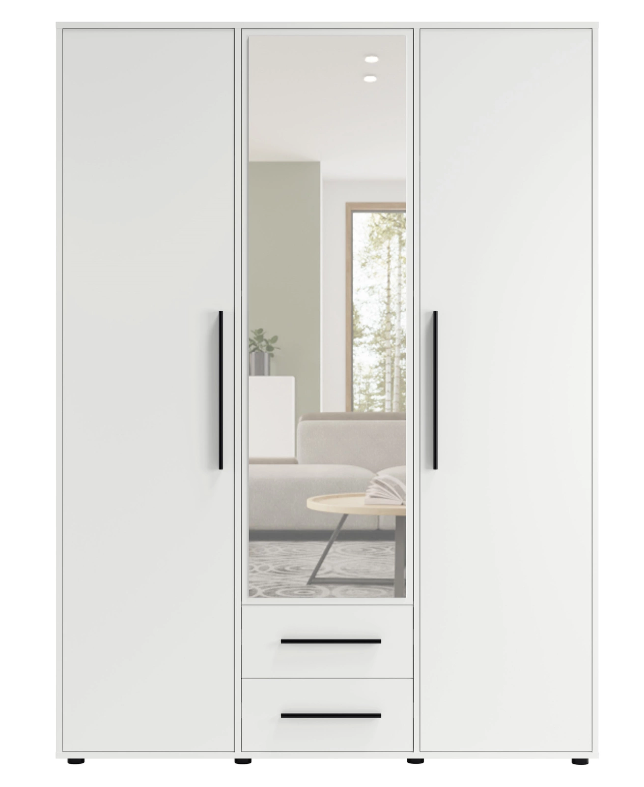- Szafa Modena biały z lustrem, 3 drzwiami, 2 szufladami, półkami i drążkami. Praktyczna, pojemna i elegancka – idealna do sypialni lub garderoby.