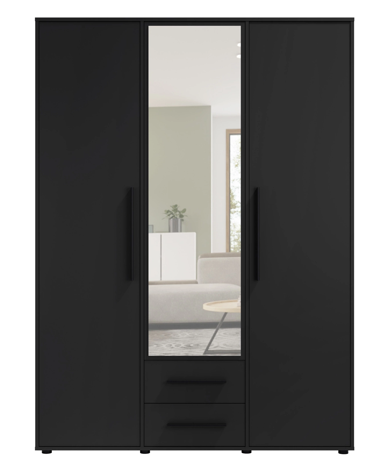 • Szafa Modena kolor czarny z lustrem, 3 drzwiami, 2 szufladami, półkami i drążkami. Praktyczna, pojemna i elegancka – idealna do sypialni lub garderoby.